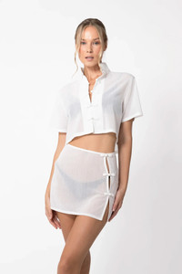 Soft knit button down mini skirt featuring signature pipa knots, may be worn as a bikini coverup with matching top MATERIAL & CARE • Shell - 95% Polyester, 2% Cotton, 3% Spandex • Unlined • Garment Care: Hand wash separately or dry clean