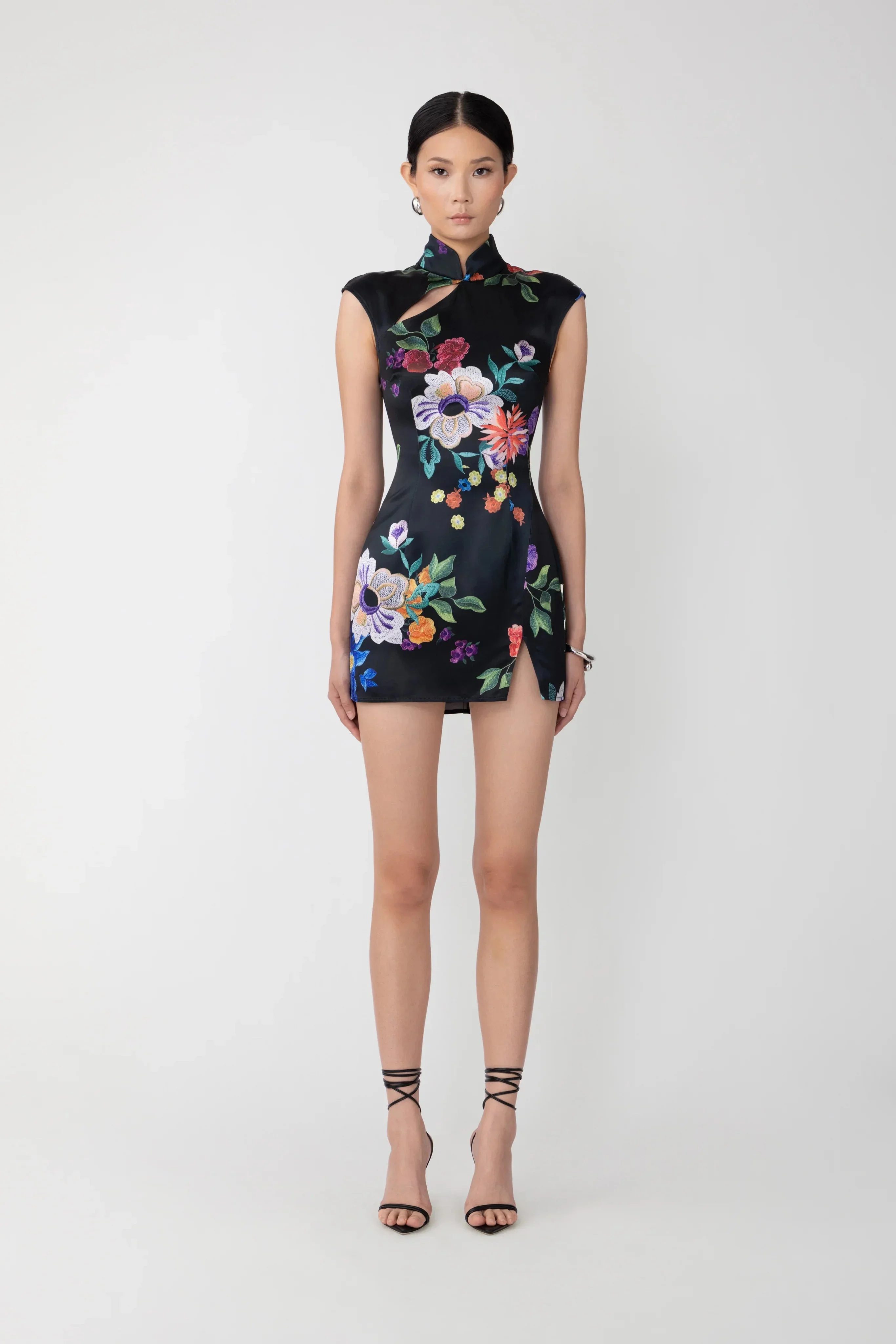 Modern Cheongsam mini dress cut from printed satin featuring Mandarin collar with cut-out detail, shoulder caps, and small thigh slit. SIZE & FIT • Fits true to size, take your normal size • Fully lined • Non-stretch fabric • Mandarin collar • Keyhole cut-out at shoulder • Mini slit at the hem • Length (shoulder to hem): size 00 - 31.3", size 0 - 31.3", size 2 - 32.1", size 4 - 32.9", size 6 - 33.7", size 8 to size 14 - 34.4" • Model's measurements: height 5'10" bust 32" waist 23.5" hips 34.5" • Model is wearing size 0 MATERIAL & CARE • Shell - 72% Acetate, 28% Polyester • Lining - 97% Polyester, 3% Spandex • Garment Care: Hand wash separately or dry clean