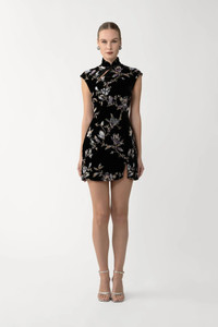 The Devon Velvet Dress is a cheongsam-inspired silhouette crafted from silk-blend velvet. Featuring a mandarin collar and a hand-tied pipa knot at the neckline, it's a clean interpretation of traditional structure in a modern cut. SIZE & FIT • Fits true to size, take your normal size • Fully lined • Length (collar to hem): size 00 to size 0 - 31.9", size 2 - 32.7", size 4 - 33.1", size 6 - 33.5", size 8 - 33.9", size 10 to size 14 - 34.3" • Model's measurements: height 5'9" bust 32.5" waist 23.5" hips 35" • Model is wearing size 2 MATERIAL & CARE • Shell - 100% Silk • Lining - 97% Polyester, 3% Spandex • Garment Care: Hand wash separately or dry clean