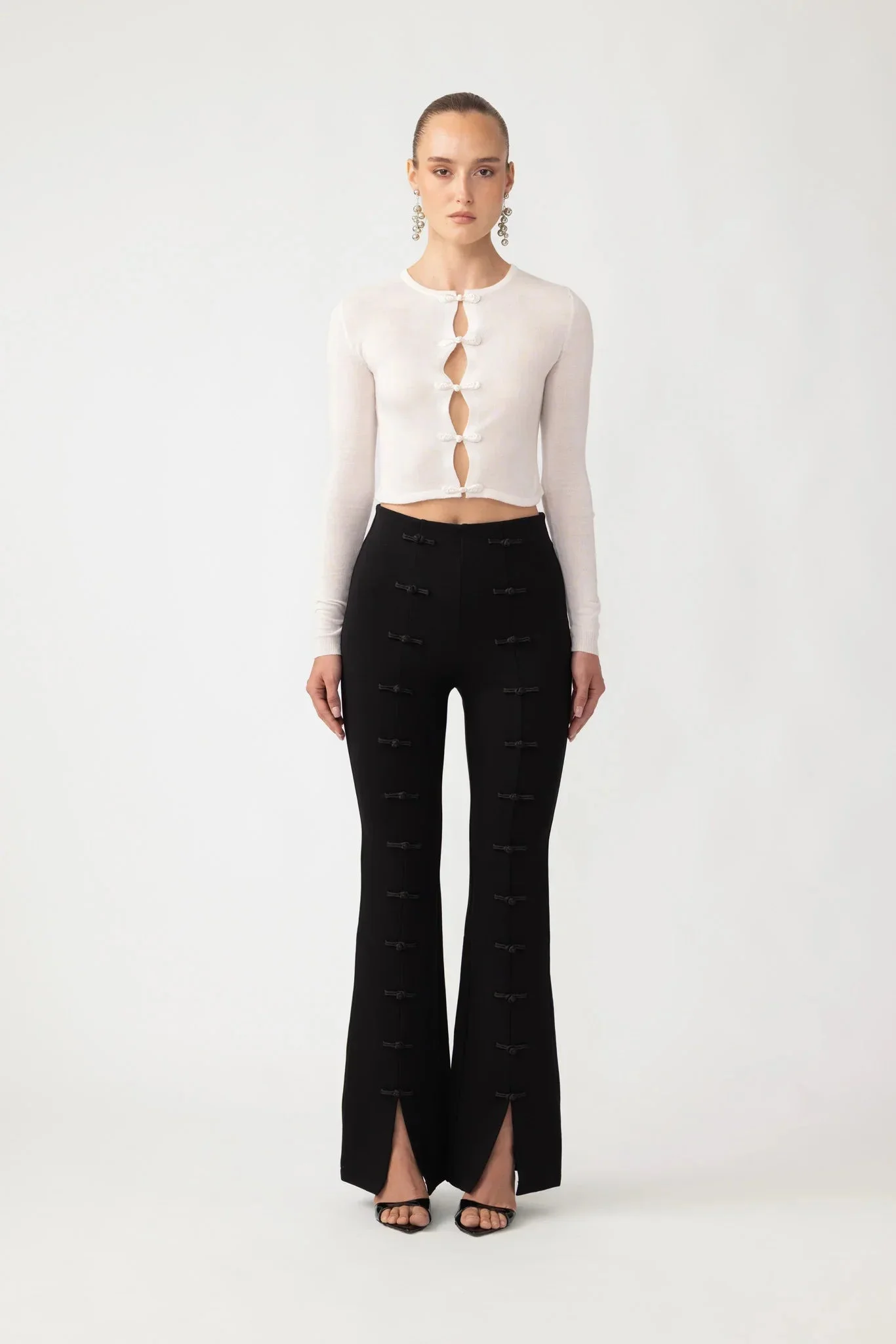 The Drew Pant is a mid-rise, flared-leg pant featuring signature hand-tied pipa knots that trace the front seam of each leg and lead to a bottom open slit. A modern twist on a vintage silhouette, perfect for styling into a versatile everyday look or casual occasion. SIZE & FIT • Fits true to size, take your normal size • Unlined • Length (waist to hem): size 00 to size 0 - 40.9", size 2 to size 14 - 42.9" • Model's measurements: height 5'9" bust 32.5" waist 23.5" hips 35" • Model is wearing size 2 MATERIAL & CARE • Shell - 62% Rayon, 33% Nylon, 5% Spandex • Lining - Unlined • Garment Care: Hand wash separately or dry clean
