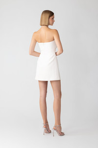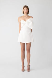 Strapless crepe mini dress featuring an asymmetrical bow design SIZE & FIT • Fits true to size, take your normal size • Designed for a closed fit • Fully lined • Non-stretch fabric • Length (bust to hem): size 00 to size 0 - 22.0", size 2 - 22.4", size 4 - 22.8", size 6 - 23.2", size 8 to size 14 - 23.6" • Model's measurements: height 5'10" bust 33" waist 24" hips 35" • Model is wearing size 2 MATERIAL & CARE • Shell - 100% Polyester • Lining - 97% Polyester, 3% Spandex • Garment Care: Hand wash separately or dry clean