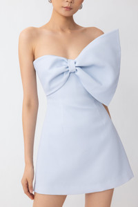 Strapless crepe mini dress featuring an asymmetrical bow design SIZE & FIT • Fits true to size, take your normal size • Designed for a closed fit • Fully lined • Non-stretch fabric • Length (bust to hem): size 00 to size 0 - 22.0", size 2 - 22.4", size 4 - 22.8", size 6 - 23.2", size 8 to size 14 - 23.6" • Model's measurements: height 5'10" bust 33" waist 24" hips 35" • Model is wearing size 2 MATERIAL & CARE • Shell - 100% Polyester • Lining - 97% Polyester, 3% Spandex • Garment Care: Hand wash separately or dry clean