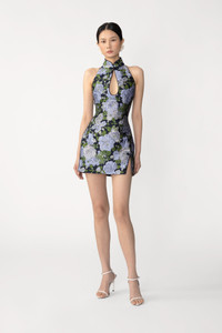 The Eva Dress is a modern halter-style mini cheongsam in a winter floral jacquard, featuring a mandarin collar adorned with a single signature hand-tied pipa knot, a keyhole cutout at the bust, and a thigh slit. MATERIAL & CARE • Shell - 100% Polyester • Lining - 97% Polyester, 3% Spandex • Garment Care: Hand wash separately or dry clean
