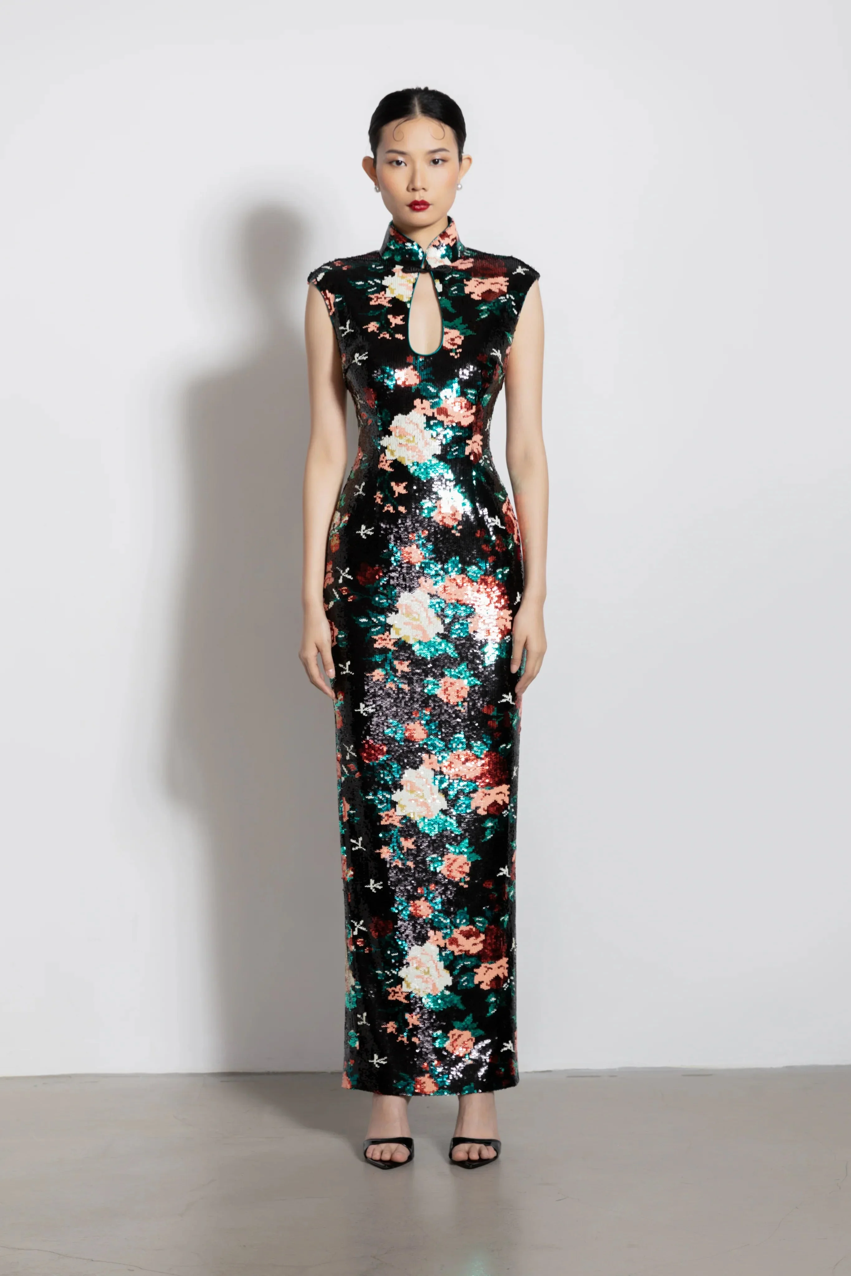 Modern Cheongsam maxi dress with slight cap sleeves and a Mandarin collar with tear drop cutout SIZE & FIT • Fits true to size, take your normal size • Length (collar to hem): size 00 to size 0 - 57.9", size 2 to size 14 - 59.8" • Model's measurements: height 5'9" bust 32" waist 25" hips 35" • Model is wearing size 2 MATERIAL & CARE • Shell - 100% Polyester with sequins • Lining - 97% Polyester, 3% Spandex • Garment Care: Hand wash separately or dry clean