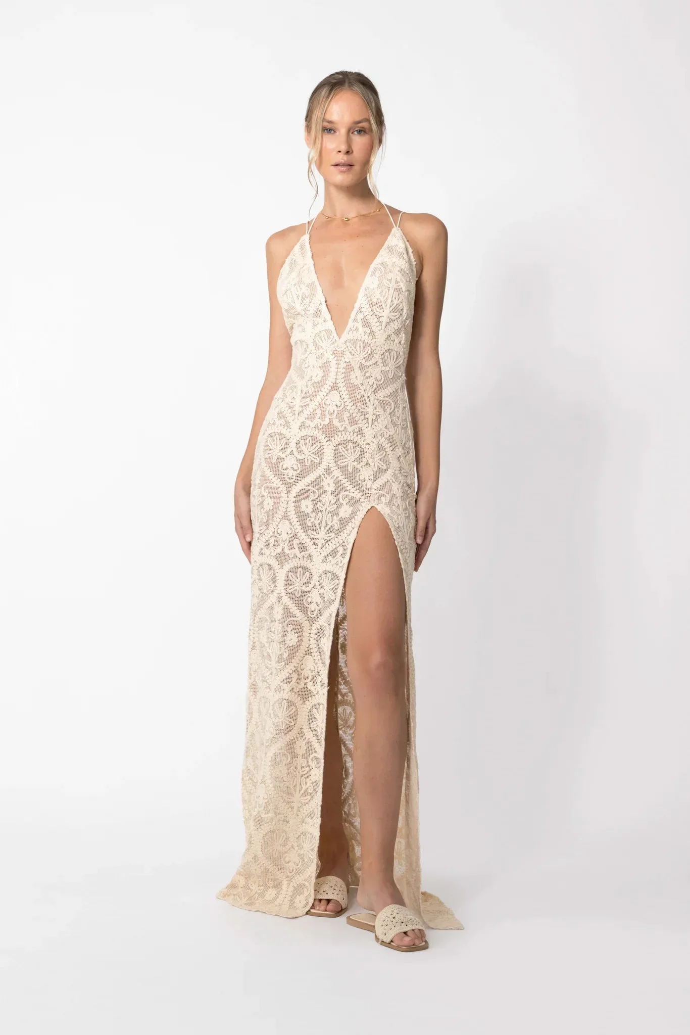 Soft crochet maxi sundress with plunging neckline, exposed back, and high slit featuring special heart-shaped pattern, may be worn over bikini MATERIAL & CARE • Shell - 100% Cotton • Unlined • Garment Care: Hand wash separately or dry clean