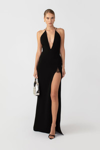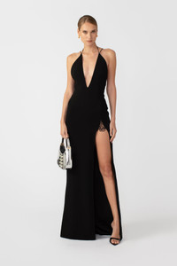 Frankie is a modern black-tie halterneck gown made of smooth crepe for a flattering fit. Featuring a plunging V-neckline, open back, and thigh-high slit with subtle lace detail for a more playful kind of elegance. SIZE & FIT • Fits true to size, take your normal size • Designed to be fitted at the bust and waist, loose at the hip • Partially lined • Non-stretch fabric • Halterneck gown with plunging V-neckline • Thigh-high slit with lace embellishment • Length (shoulder to hem): size 00 to size 0 - 47.2, size 2 to size 14 - 49.2 • Model's measurements: height 5'9" bust 32" waist 25" hips 36" • Model is wearing size 2 MATERIAL & CARE • Shell - 60% Polyester, 40% Acetate • Lining - 97% Polyester, 3% Spandex • Garment Care: Hand wash separately or dry clean
