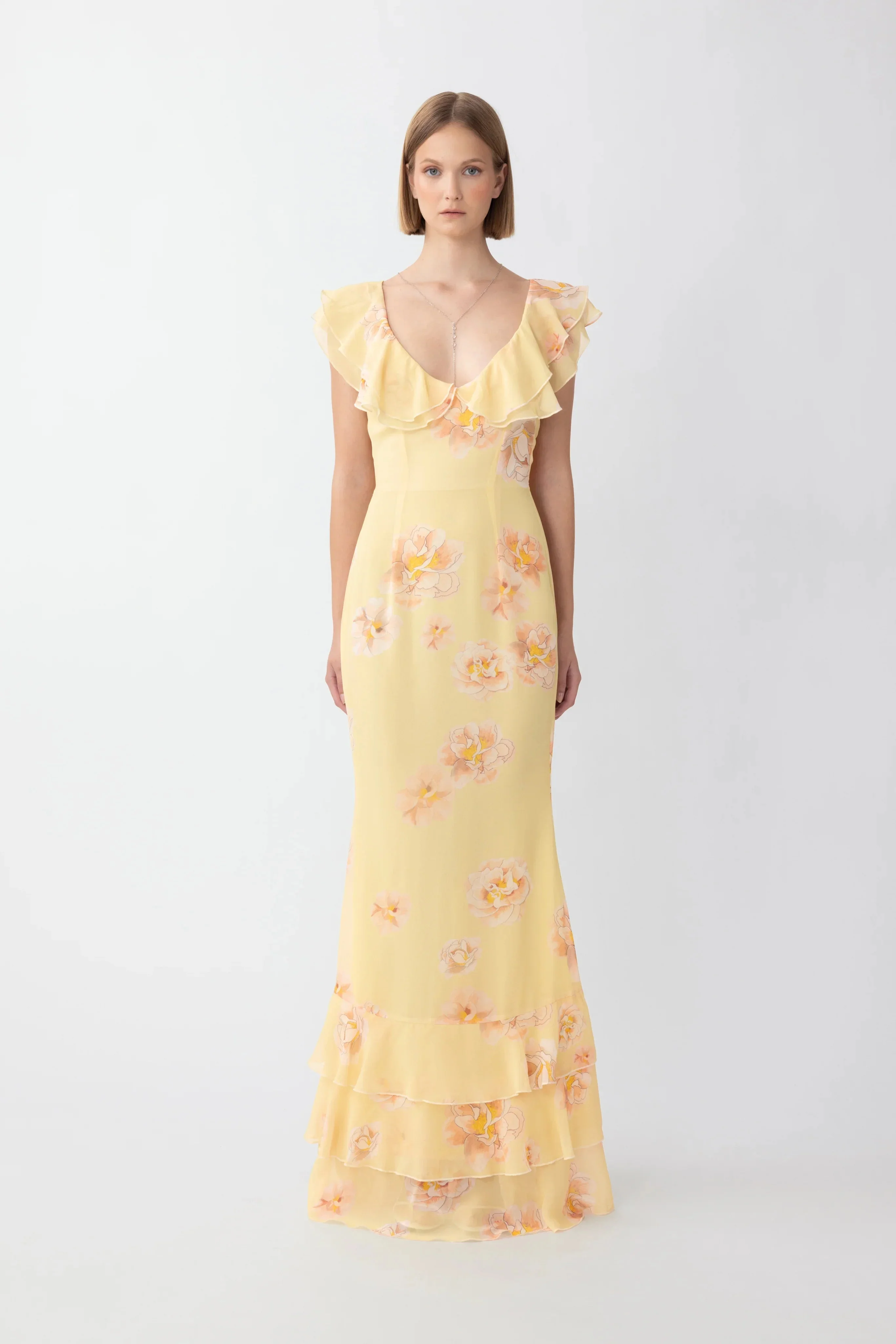 Chiffon maxi dress with a ruffled scoop neckline SIZE & FIT • Fits true to size, take your normal size • Designed to be fitted at the bust and waist, loose at the hip • Fully lined • Non-stretch fabric • Length (bust to hem): size 00 to size 0 - 53.5", size 2 - 53.9", size 4 - 54.3", size 6 - 54.7", size 8 to size 14 - 55.1" • Model's measurements: height 5'10" bust 33" waist 24" hips 35" • Model is wearing size 2 MATERIAL & CARE • Shell - 100% Polyester • Lining - 97% Polyester, 3% Spandex • Garment Care: Hand wash separately or dry clean