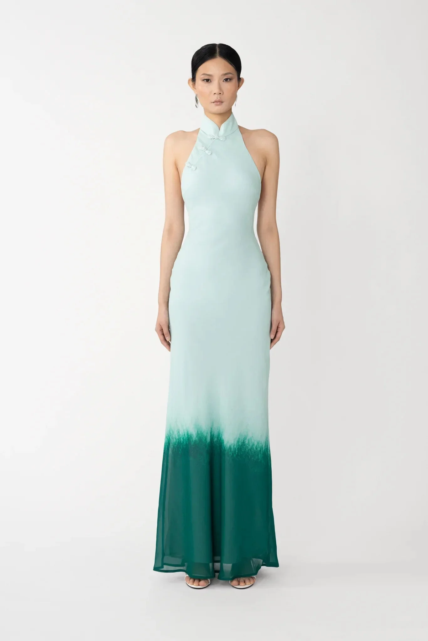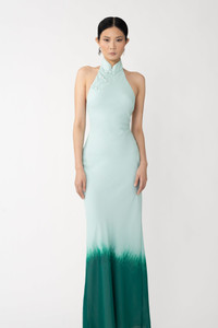 Chiffon maxi dress in bias-cut fit with high neckline featuring signature mandarin collar and pipa knot detail MATERIAL & CARE • Shell - 100% Polyester • Lining - 100% Polyester • Garment Care: Hand wash separately or dry clean