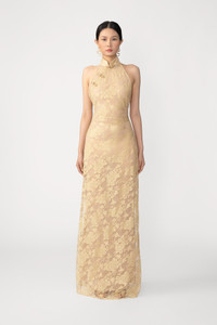The Gillian Lace Gown is a backless chiffon Cheongsam dress with a bias-cut maxi skirt and a Mandarin collar featuring our signature hand-tied pipa knot button detail. Comes with a detachable slip for added coverage. MATERIAL & CARE • Shell - 95% Polyester, 5% Metallic • Lining - 100% Polyester • Garment Care: Hand wash separately or dry clean