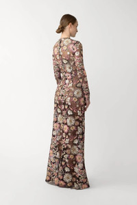 The Goldie Dress is a full-length tulle gown embellished with beaded floral sequins and long sleeves. Designed with a separate slip dress, it offers a layered approach to eveningwear. C omes with a separable slip. SIZE & FIT • Fits true to size, take your normal size • Comes with separable slip • Non-stretch fabric • Length (collar to hem): size 00 - 59.4", size 0 - 61.4", size 2 to size 14 - 63.4" • Model's measurements: height 5'10" bust 31.5" waist 23" hips 35" • Model is wearing size 2 MATERIAL & CARE • Shell - 100% Polyester • Lining - 100% Polyester • Garment Care: Hand wash separately or dry clean