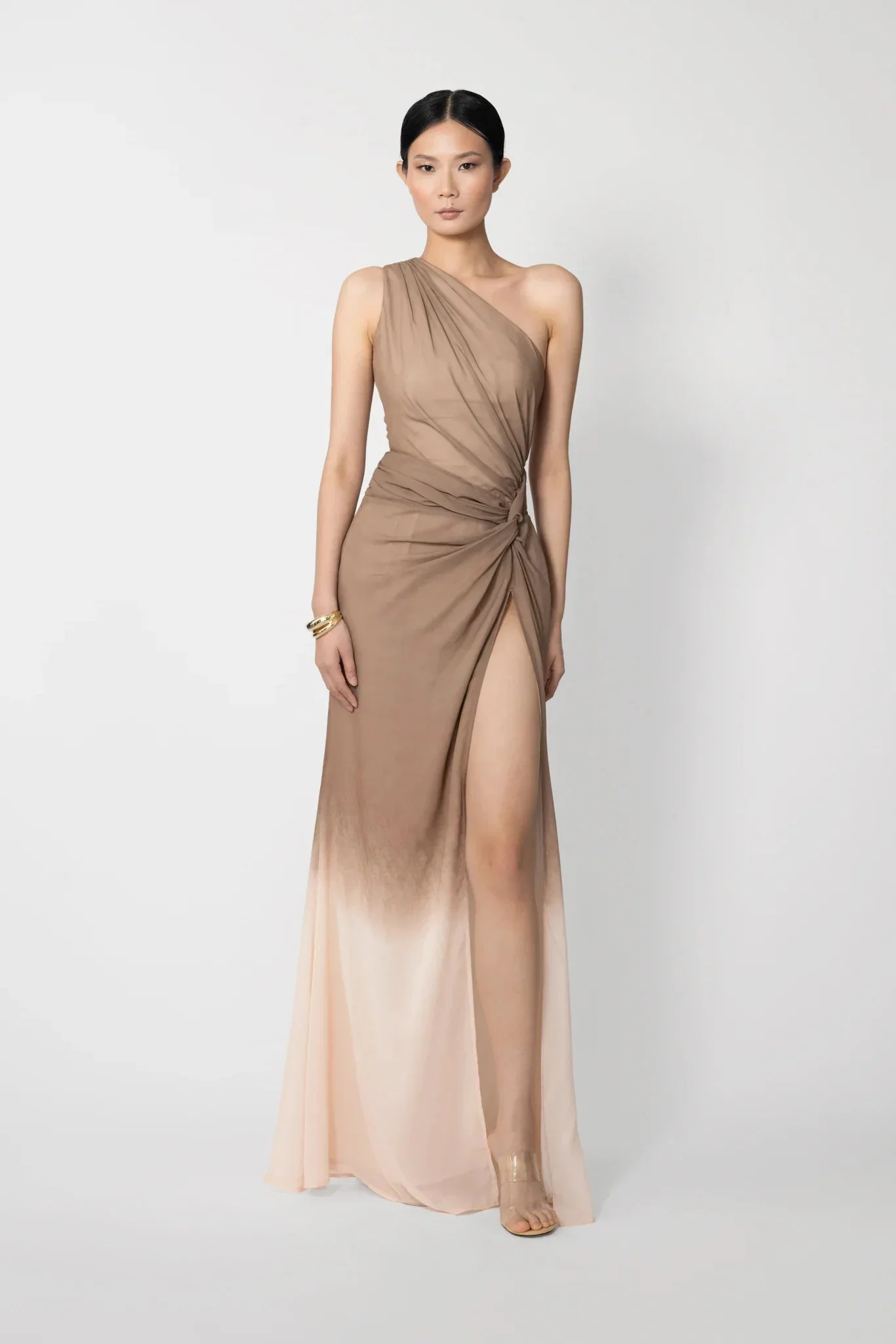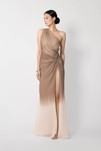 One-shoulder maxi dress in featherweight chiffon with knotted front-thigh slit SIZE & FIT • Fits true to size, take your normal size • Fully lined • Length (shoulder to hem): size 00 - 57.0", size 0 - 57.2", size 2 - 59.3", size 4 - 59.4", size 6 - 59.5", size 8 - 59.6", size 10 - 59.7", size 12 - 59.8", size 14 - 60.0" • Model's measurements: height 5'9" bust 32" waist 25" hips 35" • Model is wearing size 2 MATERIAL & CARE • Shell - 100% Polyester • Lining - 100% Polyester • Garment Care: Hand wash separately or dry clean