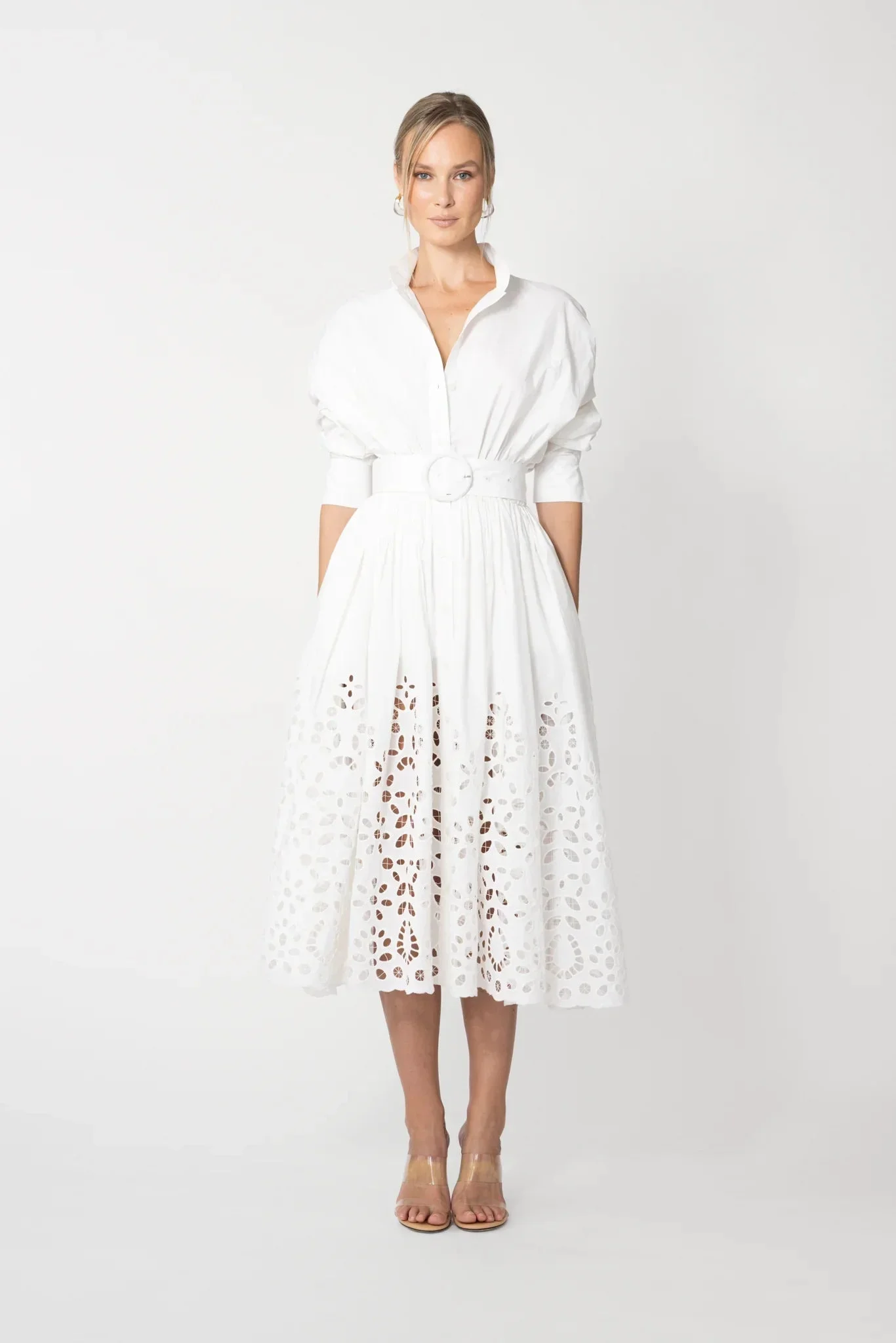 Cotton poplin midi shirtdress with classic mandarin collar, embroidered eyelet detail, and scalloped hem MATERIAL & CARE • Shell - 100% Cotton • Lining - 100% Rayon • Garment Care: Hand wash separately or dry clean
