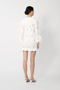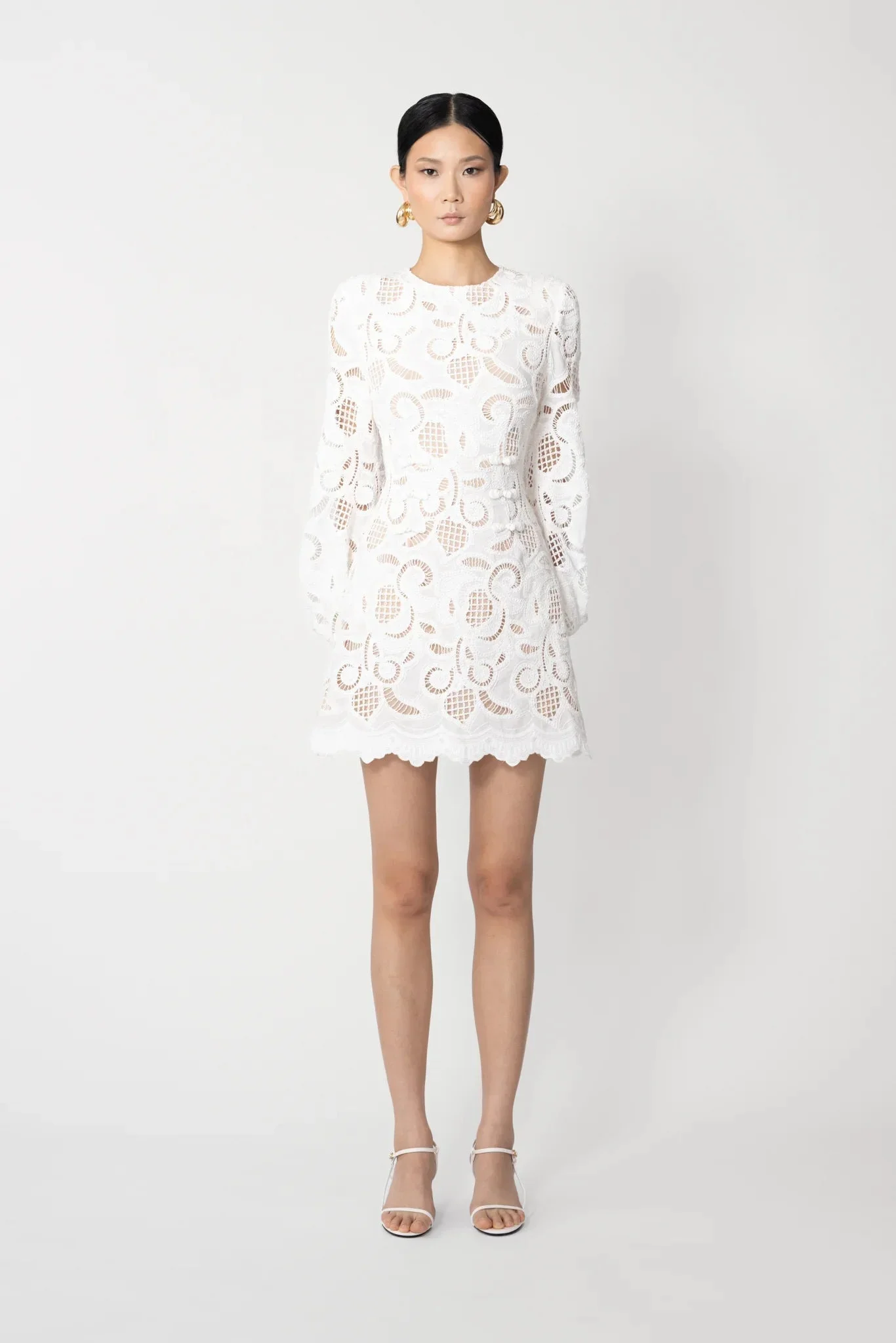 Long-sleeve high-neck cotton embroidered lace mini dress with scalloped hem MATERIAL & CARE • Shell - 100% Cotton • Lining - 100% Rayon • Garment Care: Hand wash separately or dry clean