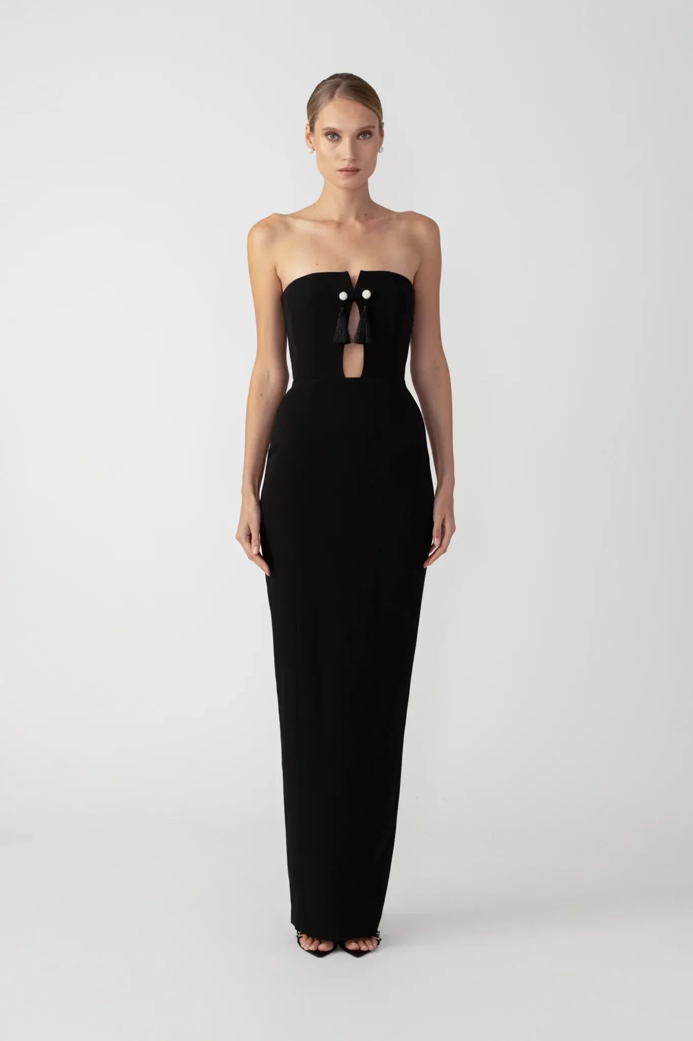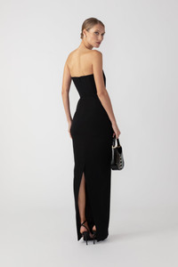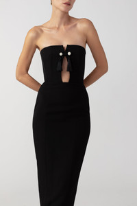 Imani is a modern black-tie strapless gown featuring a classic figure-sculpting shape. The bust is uniquely structured with internal boning featuring a playful keyhole front cut-out and button tassles. Made of premium crepe for a flattering and comfortably snug fit around the hips. SIZE & FIT • Designed for tailoring the hem length • Fits true to size, take your normal size • Designed for a close fit • Fully lined • Non-stretch fabric • Length (bust to hem): size 00 - 52.6", size 0 to size 14 - 54.5" • Model's measurements: height 5'9" bust 32" waist 25" hips 36" • Model is wearing size 2 MATERIAL & CARE • Shell - 100% Polyester • Lining - 97% Polyester, 3% Spandex • Garment Care: Hand wash separately or dry clean