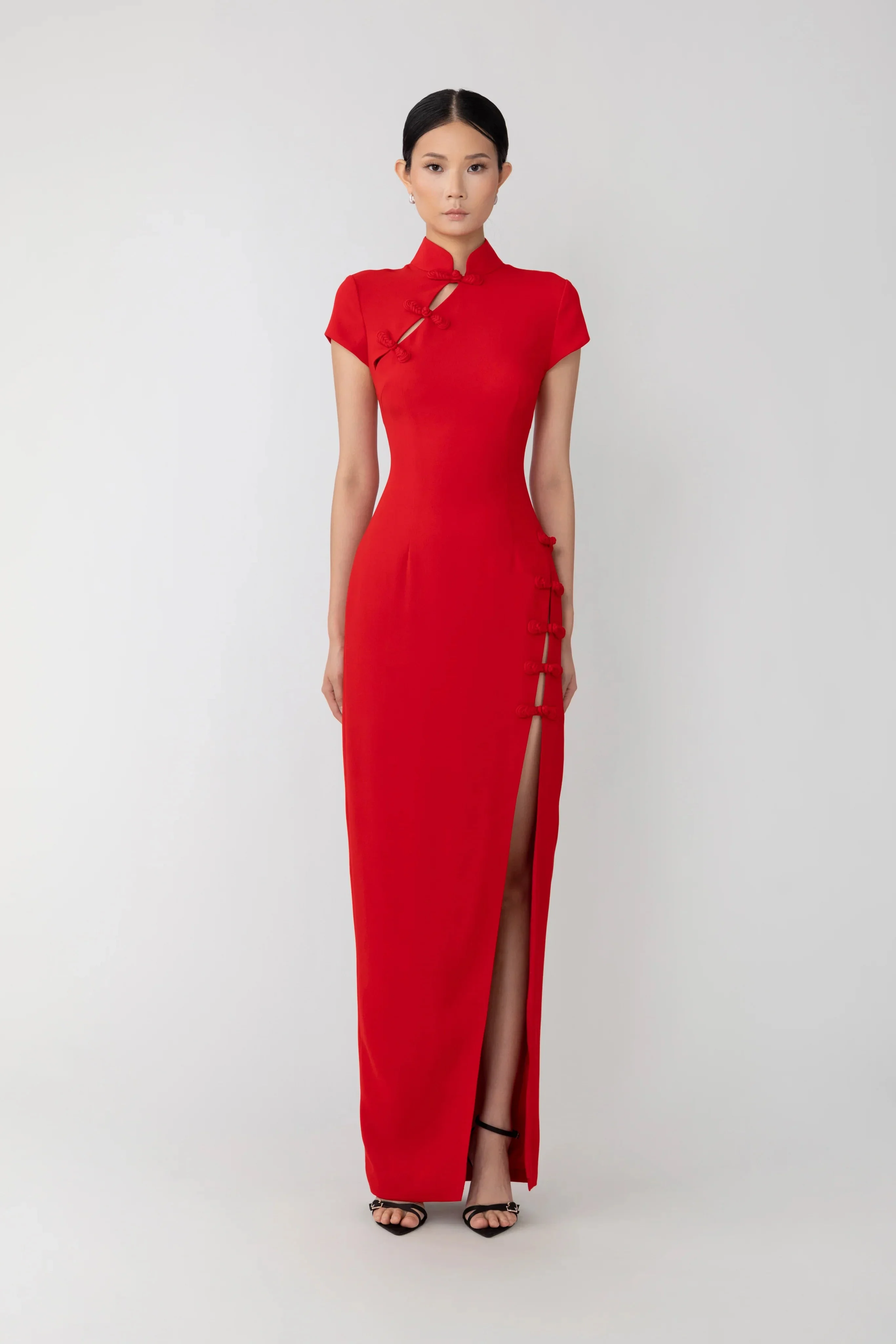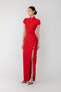 Modern Cheongsam maxi dress made of crepe for a flattering fit. Featuring a Mandarin collar with asymmetrical slits and larger signature hand-tied pipa knot button detail. SIZE & FIT • Shell - 100% Polyester • Lining - 97% Polyester, 3% Spandex • Garment Care: Hand wash separately or dry clean MATERIAL & CARE • Fits true to size, take your normal size • Designed for a slim fit • Partially lined • Non-stretch fabric • Length (shoulder to hem): size 00 to size 0 - 53.5", size 2 to size 14 - 55.5" • Model's measurements: height 5'9" bust 32" waist 25" hips 35" • Model is wearing size 2