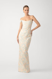 One-shoulder strap jacquard column gown with a fully-boned corset top featuring a ruched design SIZE & FIT • Fits true to size, take your normal size • Designed for a closed fit • Fully lined • Non-stretch fabric • Length (bust to hem): size 00 to size 0 - 53.9", size 2 to size 14 - 55.8" • Model's measurements: height 5'10" bust 33" waist 24" hips 35" • Model is wearing size 2 MATERIAL & CARE • Shell - 100% Polyester • Lining - 97% Polyester, 3% Spandex • Garment Care: Hand wash separately or dry clean
