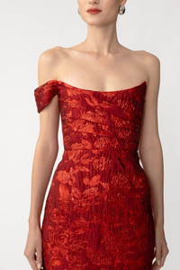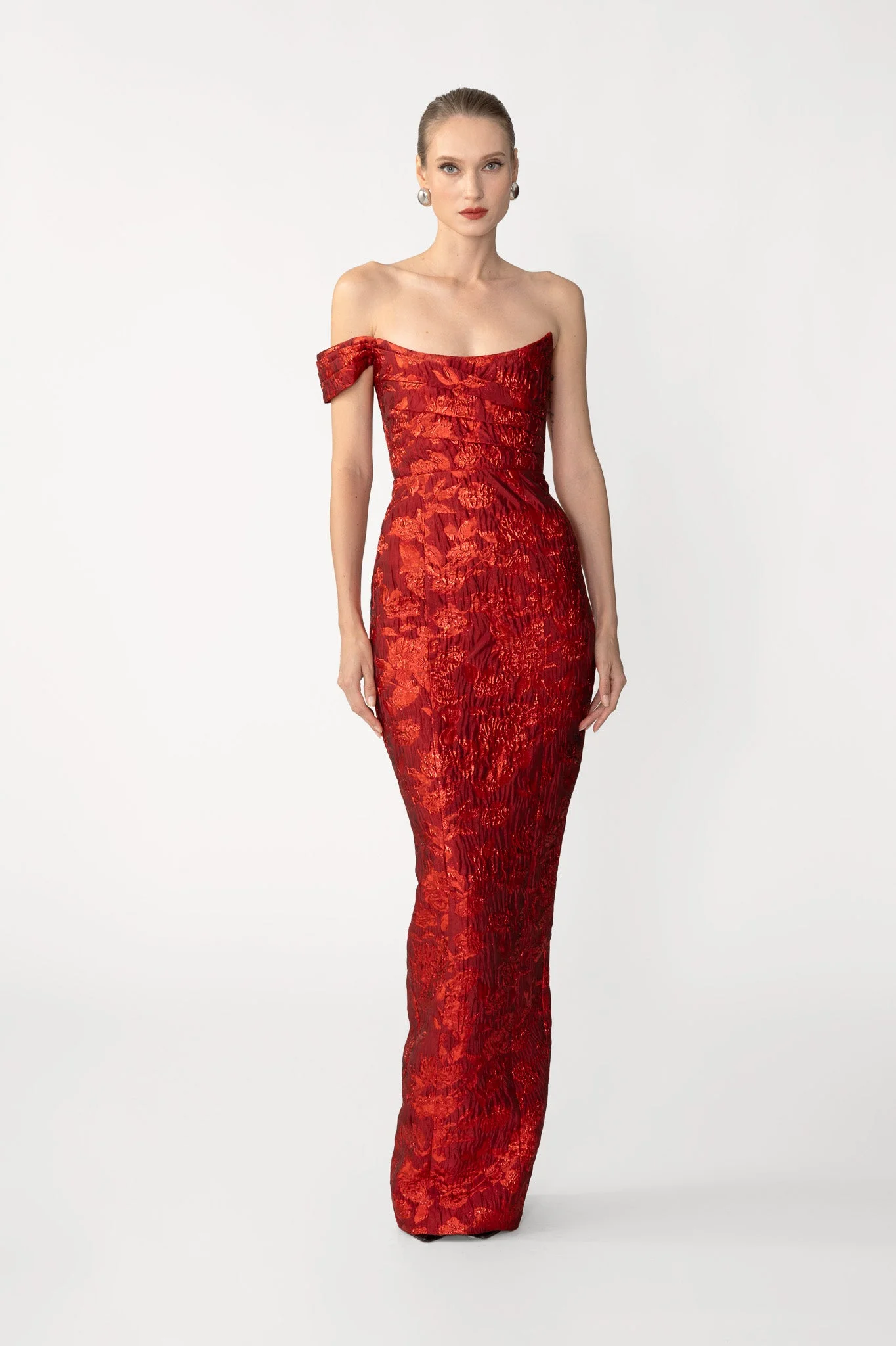 The Jackson Gown is a one-shoulder strap jacquard column gown with a fully-boned corset top featuring a ruched design. MATERIAL & CARE • Shell - 100% Polyester • Lining - 97% Polyester, 3% Spandex • Garment Care: Hand wash separately or dry clean
