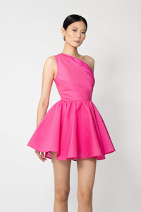 One-shoulder fit-and-flare mini dress in cloque jacquard with satin top trim MATERIAL & CARE • Shell - 100% Polyester • Lining - 97% Polyester, 3% Spandex • Garment Care: Hand wash separately or dry clean