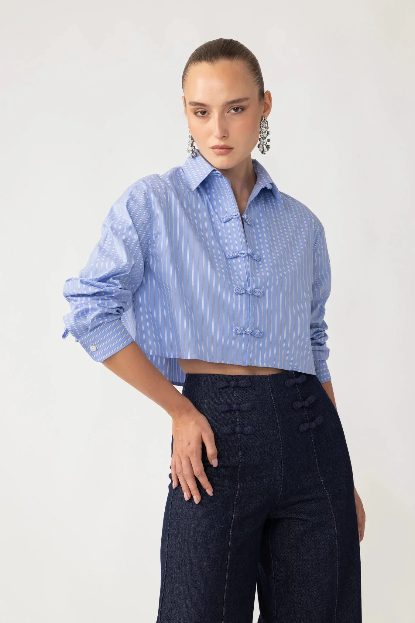 The Jonas Shirt is a cropped poplin button-up featuring a structured silhouette with hand-tied pipa knot closures—a must-have modern essential perfect for everyday occasions. SIZE & FIT • Fits true to size, take your normal size • Unlined • Length (collar to hem): size 00 to size 0 - 17.3", size 2 - 17.7", size 4 - 18.1", size 6 - 18.5", size 8 - 18.9", size 10 to size 14 - 19.3" • Model's measurements: height 5'9" bust 32.5" waist 23.5" hips 35" • Model is wearing size 2 MATERIAL & CARE • Shell - 65% Cotton, 35% Nylon • Lining - Unlined • Garment Care: Hand wash separately or dry clean