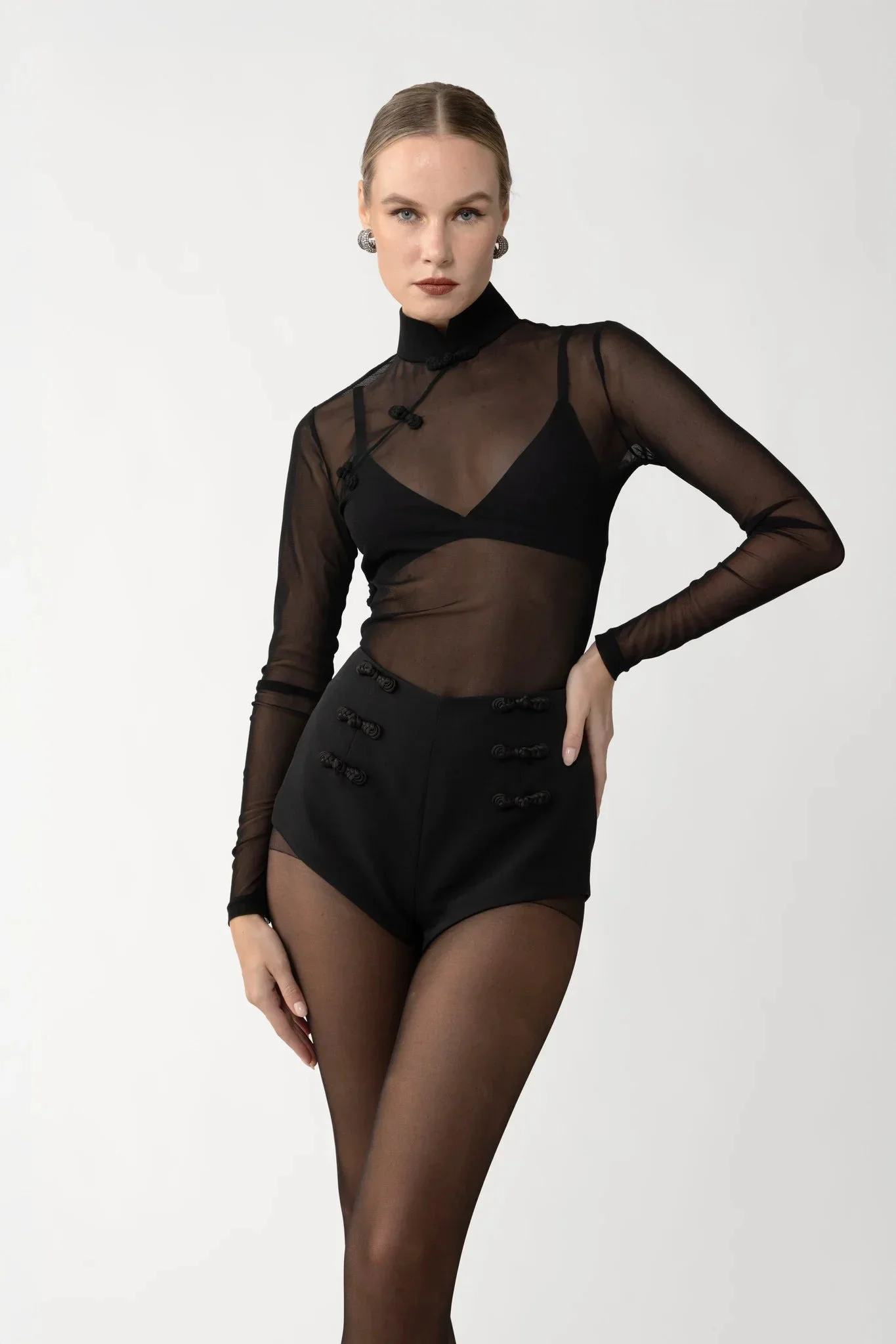 The Kia Top is crafted from lightweight sheer knit, featuring a mandarin collar and hand-tied pipa knots at the neckline. Its translucent finish lends itself to layered evening looks with modern allure. SIZE & FIT • Fits true to size, take your normal size • Unlined • Length (collar to hem): size 00 to size 0 - 18.3", size 2 - 18.7", size 4 - 19.1", size 6 - 19.5", size 8 - 19.9", size 10 to size 14 - 20.3" • Model's measurements: height 5'9" bust 32.5" waist 23.5" hips 35" • Model is wearing size 2 MATERIAL & CARE • Shell - 100% Polyester • Garment Care: Hand wash separately or dry clean