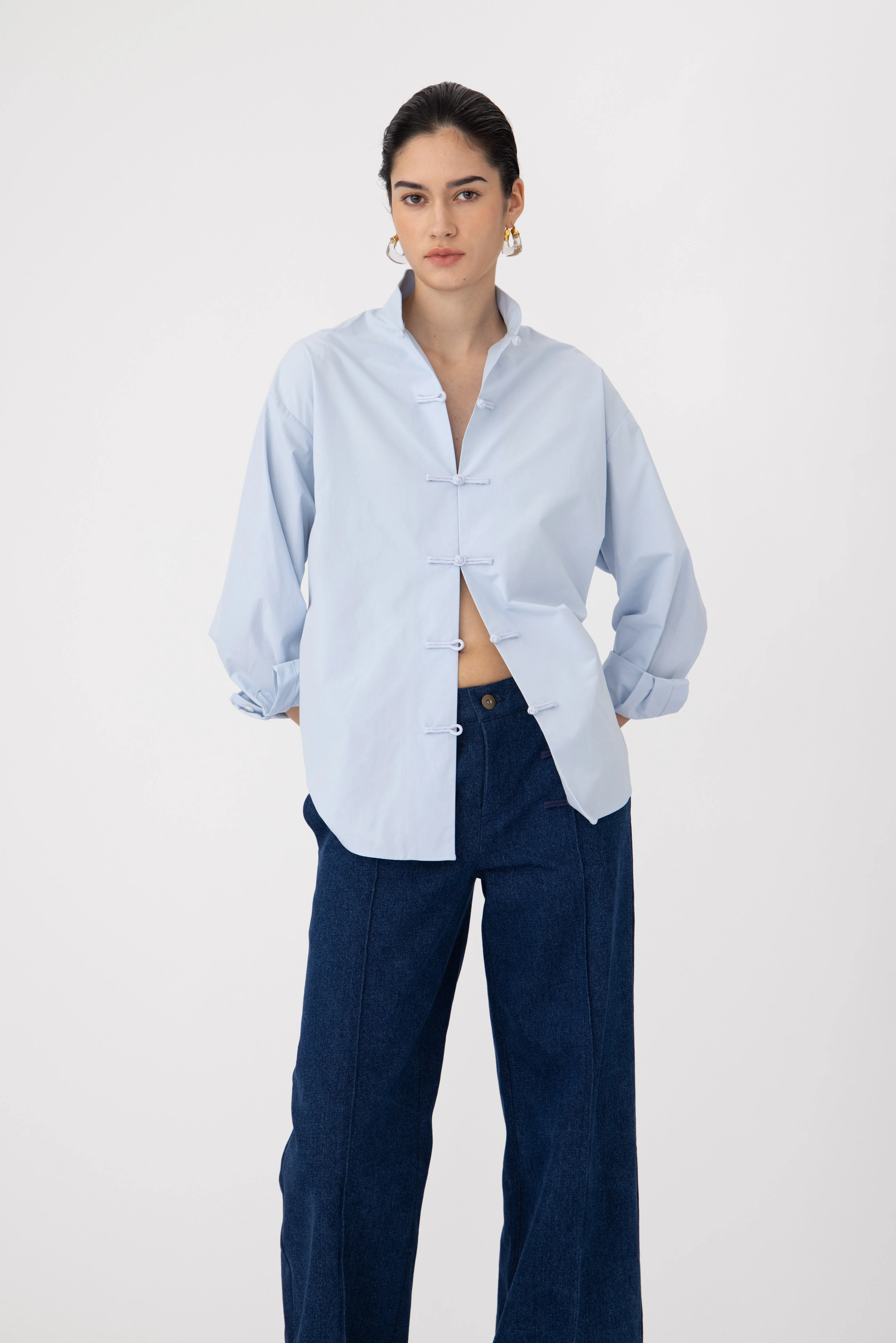 The Leo shirt is crafted from a crisp cotton-poplin that gently holds its shape, featuring an oversized fit, a mandarin collar, and a contemporary curved hem. Hand-tied knot button offers an artful detail, making this piece a versatile and indispensable wardrobe essential. SIZE & FIT • Fits true to size, take your normal size • Unlined • Length (collar to hem): size 00 to size 0 - 28.1", size 2 - 28.9", size 4 - 29.3", size 6 - 29.7", size 8 to size 14 - 30.1" • Model's measurements: height 5'9" bust 32.5" waist 23.5" hips 35" • Model is wearing size 2 MATERIAL & CARE • Shell - 100% Cotton • Lining - Unlined • Garment Care: Hand wash separately or dry clean