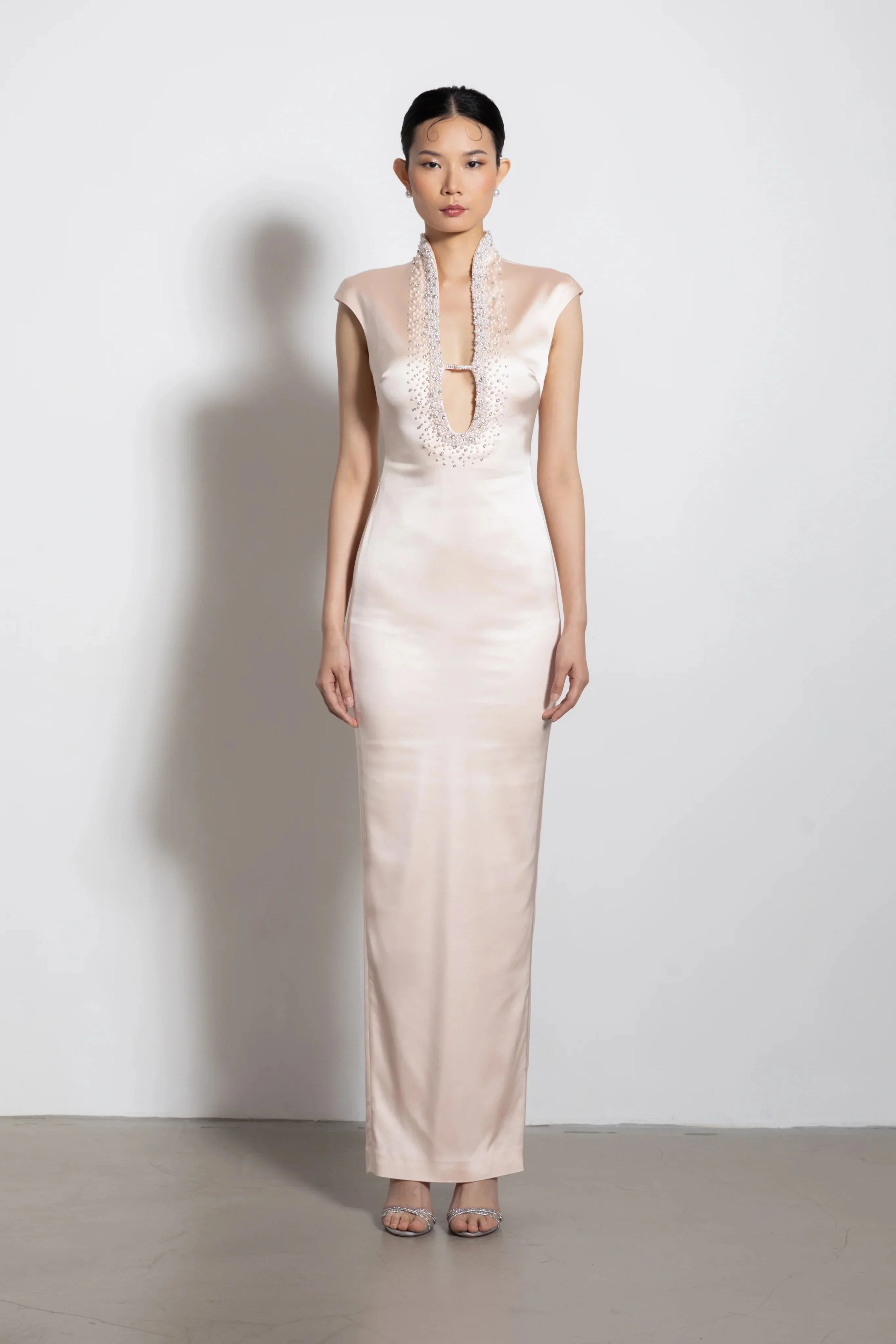 Modern Cheongsam gown with slight cap sleeves, Mandarin collar and plunging neckline SIZE & FIT • Fits true to size, take your normal size • Length (collar to hem): size 00 - 62.6", size 0 - 62.8", size 2 - 65.0", size 4 - 65.2", size 6 - 65.4", size 8 - 65.6", size 10 - 65.7", size 12 - 65.9", size 14 - 66.1" • Model's measurements: height 5'9" bust 32" waist 25" hips 35" • Model is wearing size 2 MATERIAL & CARE • Shell - 63% Acetate, 34% Nylon, 3% Spandex • Lining - 95% Polyester, 5% Spandex • Garment Care: Hand wash separately or dry clean