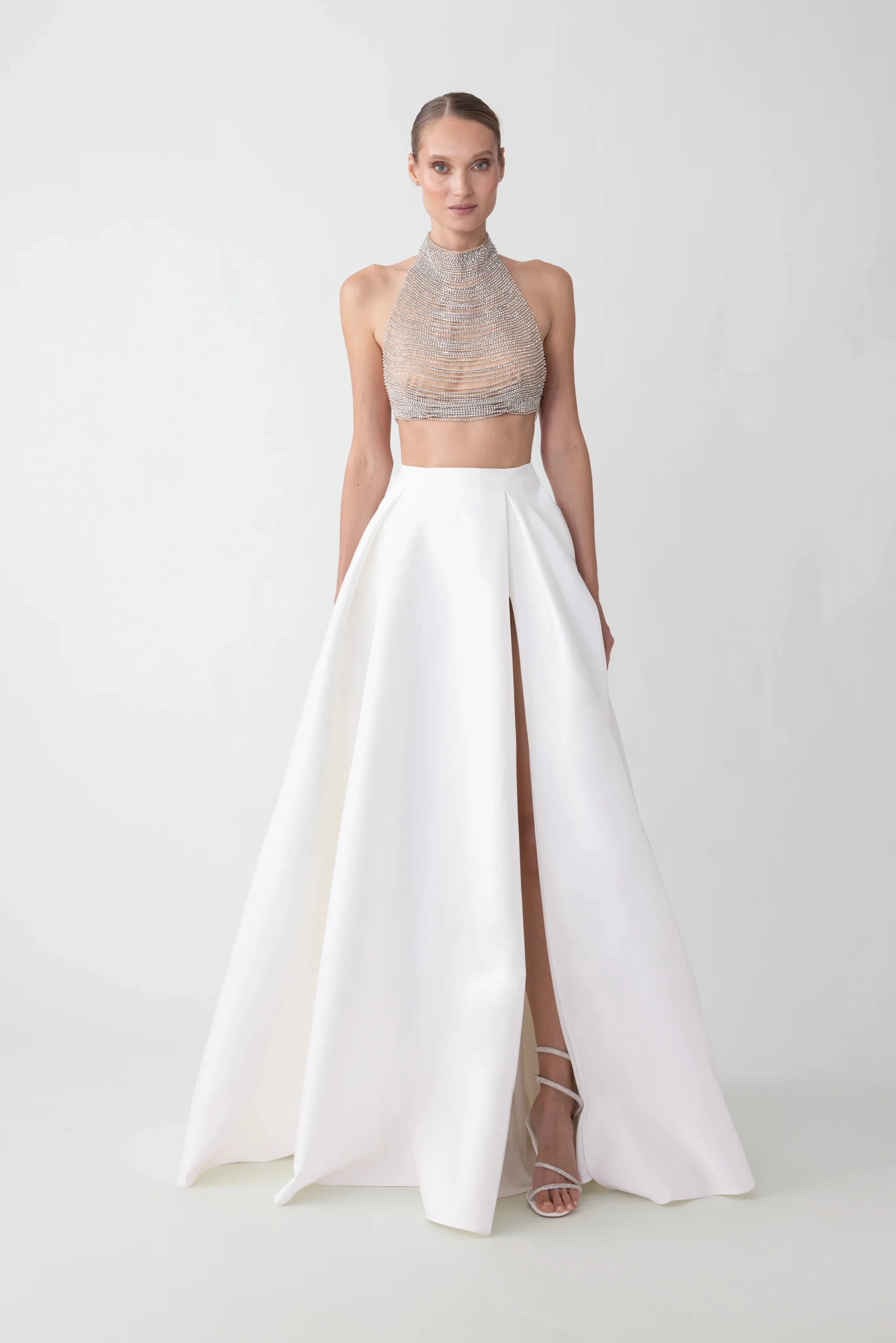 Voluminous duchess satin gala skirt featuring thigh-high slit and hidden pockets SIZE & FIT • Fits true to size, take your normal size • Fully lined • Non-stretch fabric • Length (waist to hem): size 00 to size 0 - 47.2", size 2 to size 14 - 49.2" • Model's measurements: height 5'9" bust 32" waist 25" hips 36" • Model is wearing size 2 MATERIAL & CARE • Shell - 100% Polyester • Lining - 97% Polyester, 3% Spandex • Garment Care: Hand wash separately or dry clean
