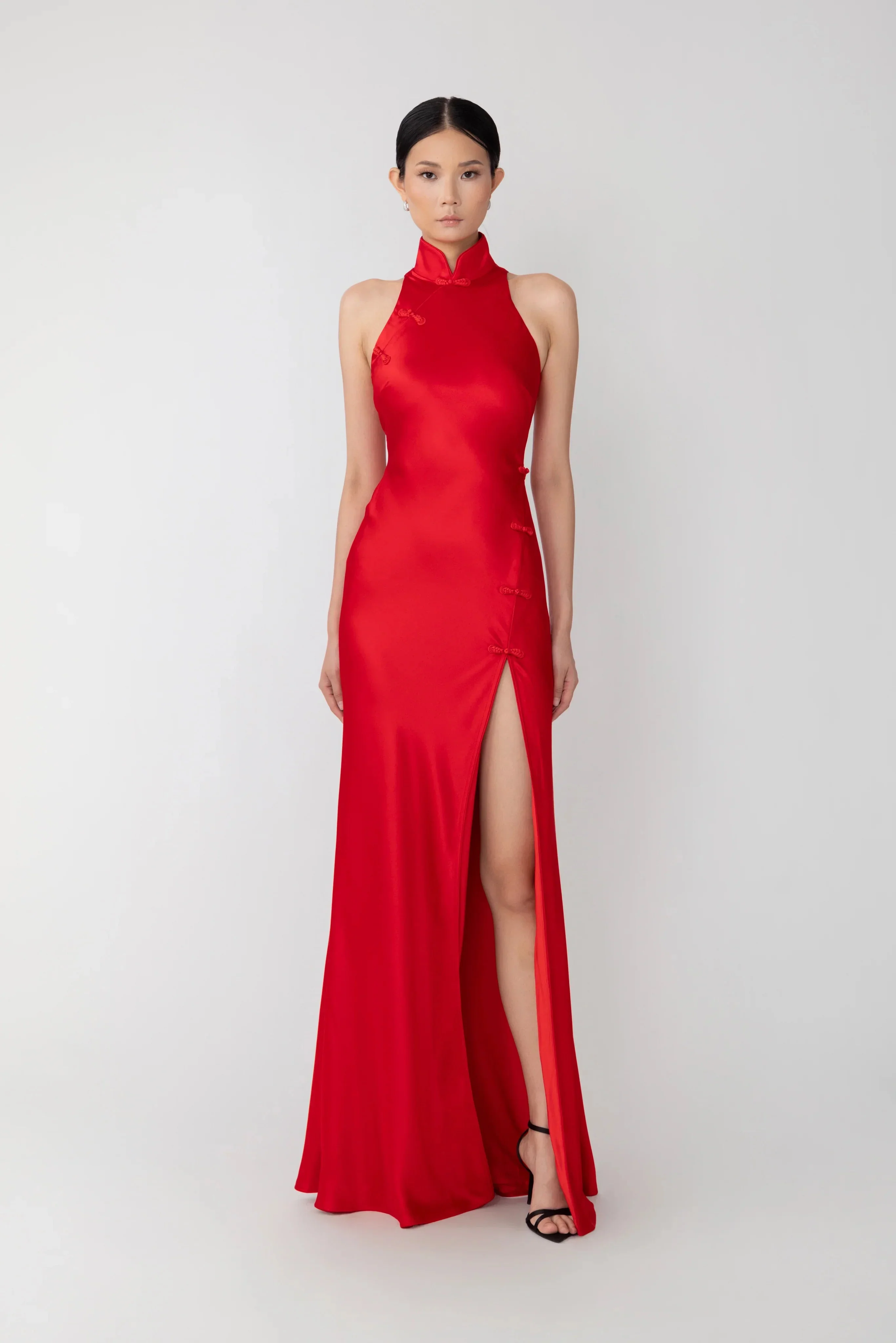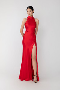Modern Cheongsam satin gown with racerback top and thigh-high slit, featuring a Mandarin collar and signature hand-tied pipa knot button detail. SIZE & FIT • Fits true to size, take your normal size • Designed for tailored hem length • Designed for a close fit • Partially lined • Stretch fabric • Halterneck with hook and eye closure • Concealed zip fastening along back • Length (shoulder to hem): size 00 - 59.8", size 0 - 59.8", size 2 to size 14 - 61.8" • Model's measurements: height 5'9" bust 31.5" waist 23" hips 35" • Model is wearing size 2 MATERIAL & CARE • Shell - 53% Viscose, 47% Rayon • Garment Care: Hand wash separately or dry clean