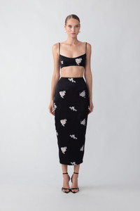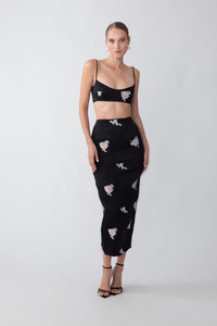 Embroidered satin set with a bralette and a pencil skirt SIZE & FIT • Fits true to size, take your normal size • Fully lined • Non-stretch fabric • Length (waist to hem): size 00 to size 0 - 35.0", size 2 - 35.8", size 4 - 36.2", size 6 - 36.6", size 8 to size 14 - 37.0" • Model's measurements: height 5'9" bust 32" waist 25" hips 36" • Model is wearing size 2 MATERIAL & CARE • Shell - 100% Polyester • Lining - 97% Polyester, 3% Spandex • Garment Care: Hand wash separately or dry clean