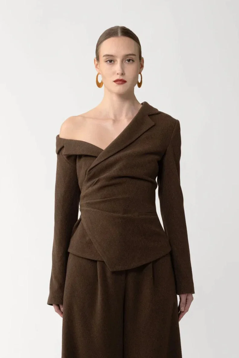 The Neve Top is cut from a wool blend with an asymmetric off-shoulder neckline and a waist-hugging fit. A modern approach to tailoring—designed to pair with the matching Neve Pant. SIZE & FIT • Fits true to size, take your normal size • Fully lined • Length (collar to hem): size 00 - 20.3", size 2 - 21.1", size 4 - 21.5", size 6 - 21.9", size 8 - 22.2", size 10 to size 14 - 22.6" • Model's measurements: height 5'10" bust 31.5" waist 23" hips 35" • Model is wearing size 2 MATERIAL & CARE • Shell - 60% Polyester, 16% Acrylic, 14% Cotton, 9% Wool, 1% Spandex • Lining - 97% Polyester, 3% Spandex • Garment Care: Hand wash separately or dry clean