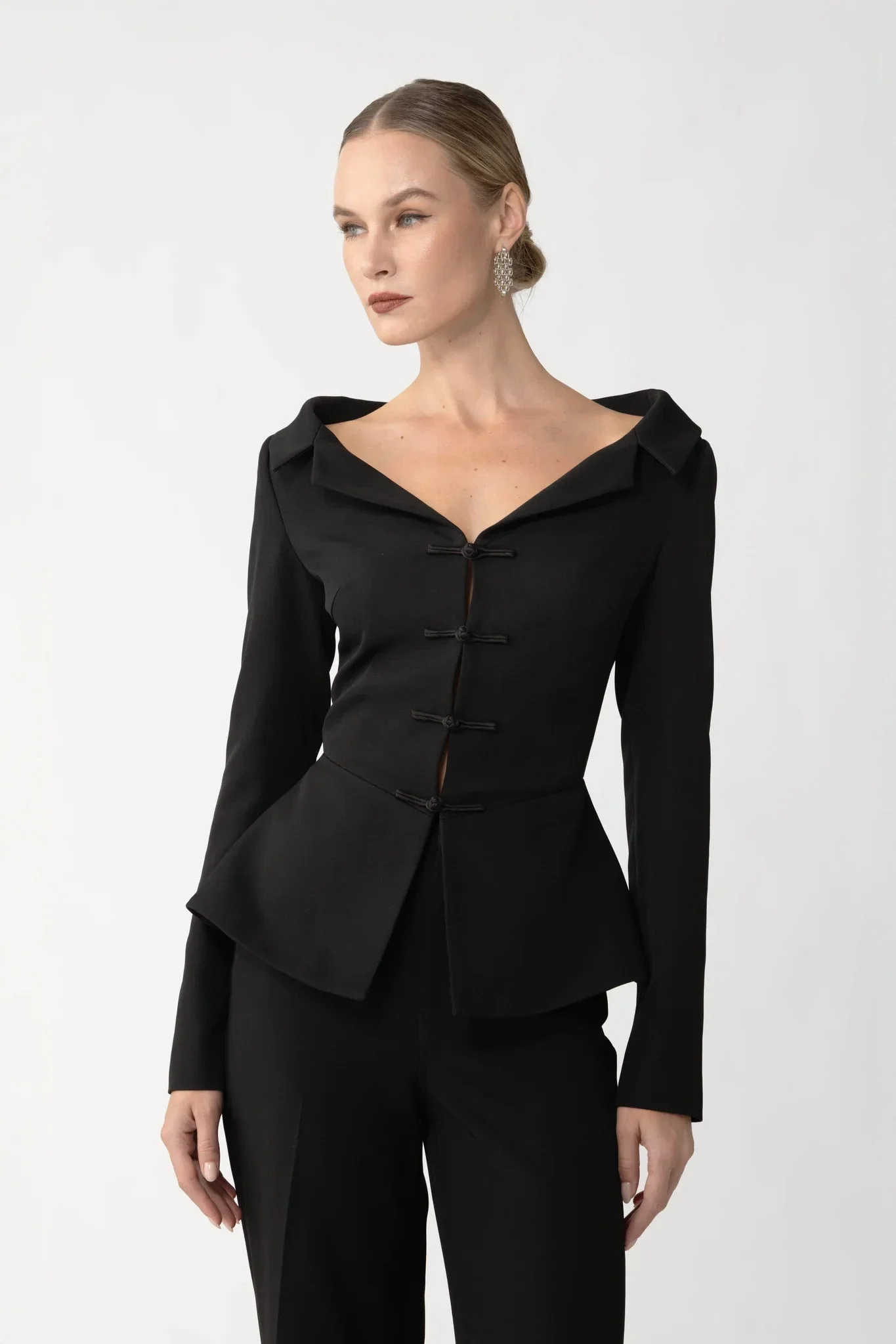 This medium-weight crepe top is tailored off the shoulder for a flattering fit that sculpts the bust and cinches the waist with classic pankou buttons. Pair this with the Niope Pant for a complete look MATERIAL & CARE • Shell - 100% Polyester • Lining - 97% Polyester, 3% Spandex • Garment Care: Hand wash separately or dry clean
