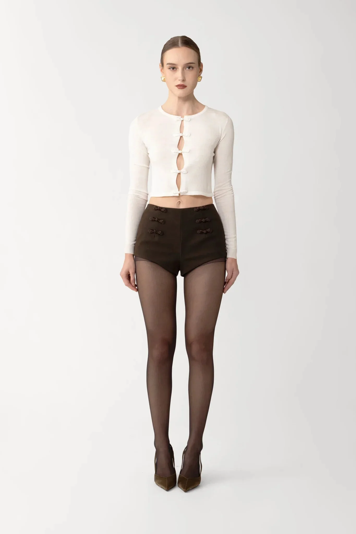 The Niki Shorts are cut in faux suede for a figure-hugging fit. Features our signature hand-tied pipa knots. SIZE & FIT • Fits true to size, take your normal size • Fully lined • Non-stretch fabric • Length (waist to hem): size 00 to size 0 - 8.3", size 2 - 8.7", size 4 - 9.1", size 6 - 9.4", size 8 to size 14 - 9.8" • Model's measurements: height 5'10" bust 31.5" waist 23" hips 35" • Model is wearing size 2 MATERIAL & CARE • Shell - 50% Nylon, 50% PU • Lining - 97% Polyester, 3% Spandex • Garment Care: Hand wash separately or dry clean