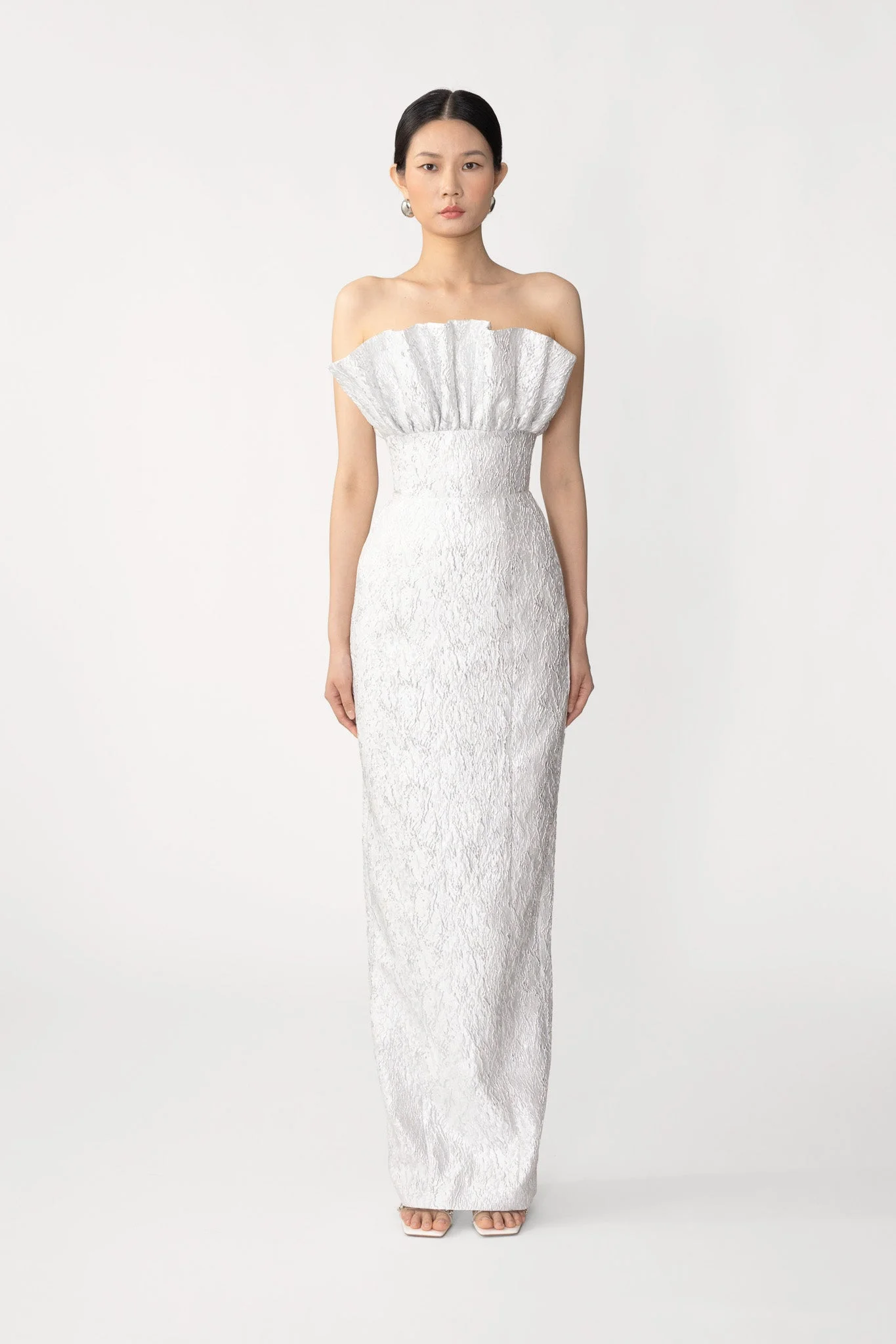 Strapless fitted jacquard gown with a waist panel and internal boning featuring a stiff ruffle detail at the bust MATERIAL & CARE • Shell - 100% Polyester • Lining - 97% Polyester, 3% Spandex • Garment Care: Hand wash separately or dry clean
