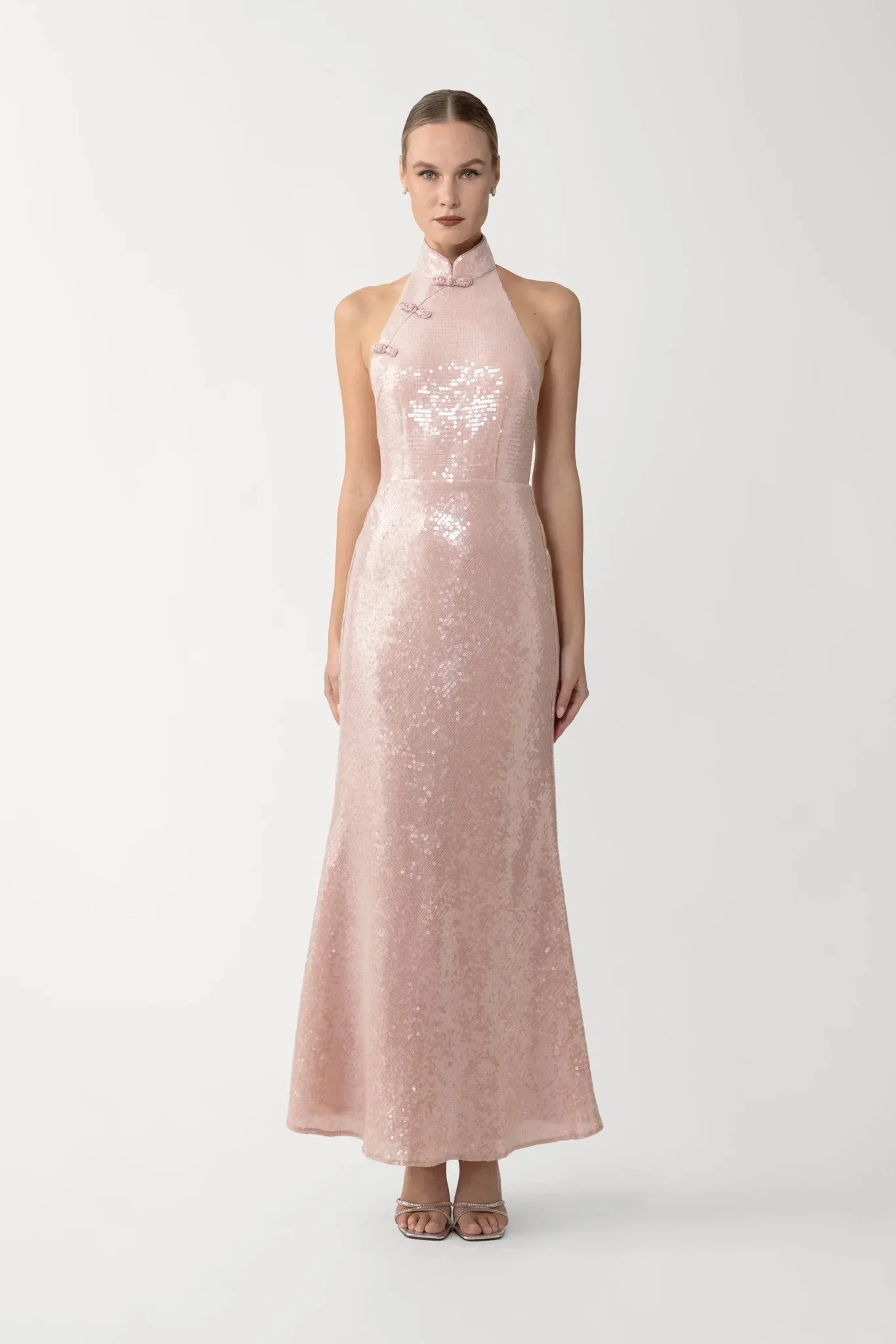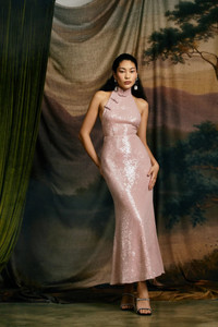 The Ophelia Dress is cut from shimmering sequins that contour the body and flow into a softly flared hem. Featuring a halter neckline and open-back design, it’s finished with a signature mandarin collar and hand-tied pipa knot detailing—perfect for an eye-catching occasion. SIZE & FIT • Fits true to size, take your normal size • Designed for a slim fit • Partially lined • Non-stretch fabric • Chinese collar and buttons • Length (collar to hem): size 00 - 46.9", size 0 - 48.8", size 2 to size 14 - 50.8" • Model's measurements: height 5'10" bust 31.5" waist 23" hips 35" • Model is wearing size 2 MATERIAL & CARE • Shell - 100% Polyester • Lining - 100% Polyester • Garment Care: Hand wash separately or dry clean