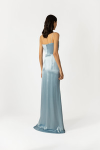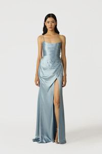 Pasha is luxury redefined in lustrous satin characterised by a curved neckline with a singular strap of crystals and thigh-high slit. Featuring a fully boned corset bodice, pleating details along the top and skirt and crystal knot buttons along the side waist, this sophisticated piece is guaranteed to command attention wherever you go. Designed for tailored hem length. SIZE & FIT • Fits true to size, take your normal size • Designed for a close fit • Partially lined • Non-stretch fabric • Asymmetrical with one crystal strap • Bodice with internal boning • Concealed zip fastening along back • Length (underarm to hem): size 00 to size 0 - 55.9", size 2 - 57.9", size 4 to size 14 - 57.9" • Model's measurements: height 5'10" bust 31.5" waist 23" hips 35" • Model is wearing size 2 MATERIAL & CARE • Shell - 75% Acetate, 25% Polyester • Lining - 97% Polyester, 3% Spandex • Garment Care: Hand wash separately or dry clean