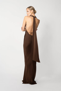 Halter satin gown in bias-cut fit with cowl neckline featuring enlogated statement wings that drape from the back of the neck MATERIAL & CARE • Shell - 100% Viscose • Unlined • Garment Care: Hand wash separately or dry clean