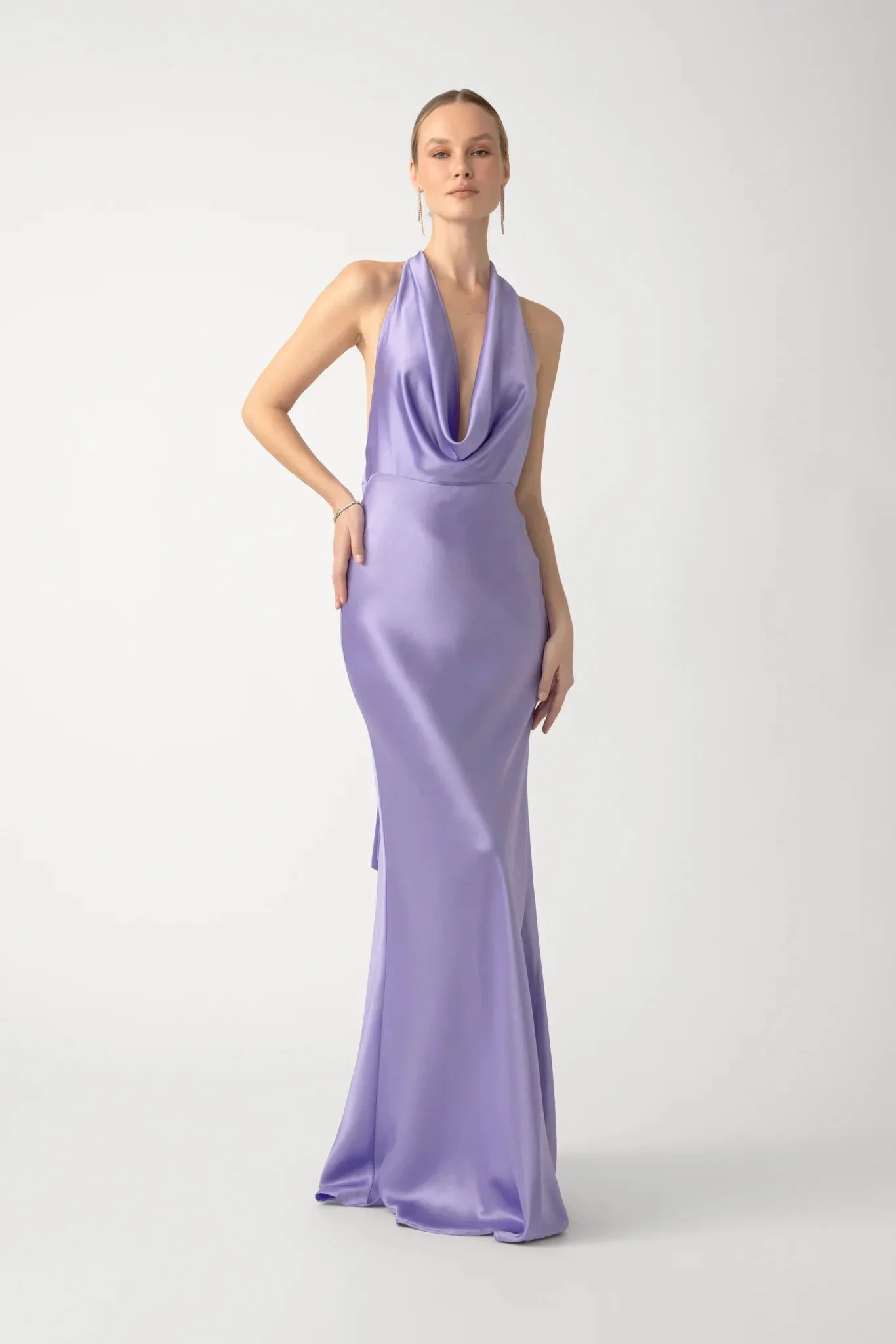Halter satin gown in bias-cut fit with cowl neckline featuring elongated statement wings that drape from the back of the neck SIZE & FIT • Fits true to size, take your normal size • Designed for a slim fit • Unlined • Non-stretch fabric • Length (collar to hem): size 00 to, size 0 - 42.7", size 2 to size 14 - 44.7" • Model's measurements: height 5'9" bust 32" waist 25" hips 36" • Model is wearing size 2