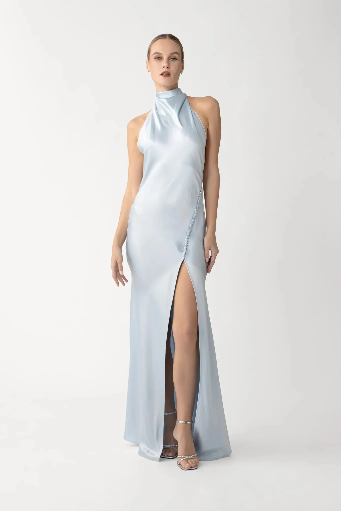 Penelope is our top bestseller that is guaranteed to make you feel effortlessly beautiful and captivating. A stunning bias-cut satin gown featuring a high neck, a low-cut back and open sides, a thigh-high side slit with covered button detail at the hip, and a large statement wings at the back of the neck. SIZE & FIT • Fits true to size, take your normal size • Designed for a slim fit • Unlined • Non-stretch fabric • Length (collar to hem): size 00 to, size 0 - 42.7", size 2 to size 14 - 44.7" • Model's measurements: height 5'9" bust 32" waist 25" hips 36" • Model is wearing size 2 MATERIAL & CARE • Shell - 53% Viscose, 47% Rayon • Garment Care: Hand wash separately or dry clean