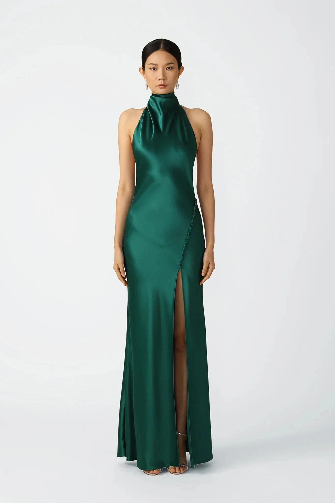 Penelope is our top bestseller that is guaranteed to make you feel effortlessly beautiful and captivating. A stunning bias-cut satin gown featuring a high neck, a low-cut back and open sides, a thigh-high side slit with covered button detail at the hip, and a large statement wings at the back of the neck. SIZE & FIT • Fits true to size, take your normal size • Designed for a slim fit • Unlined • Non-stretch fabric • Halter neck with buttons at the back of the neck • Bump friendly - select one size up from your usual size MATERIAL & CARE • Shell - 53% Viscose, 47% Rayon • Garment Care: Hand wash separately or dry clean