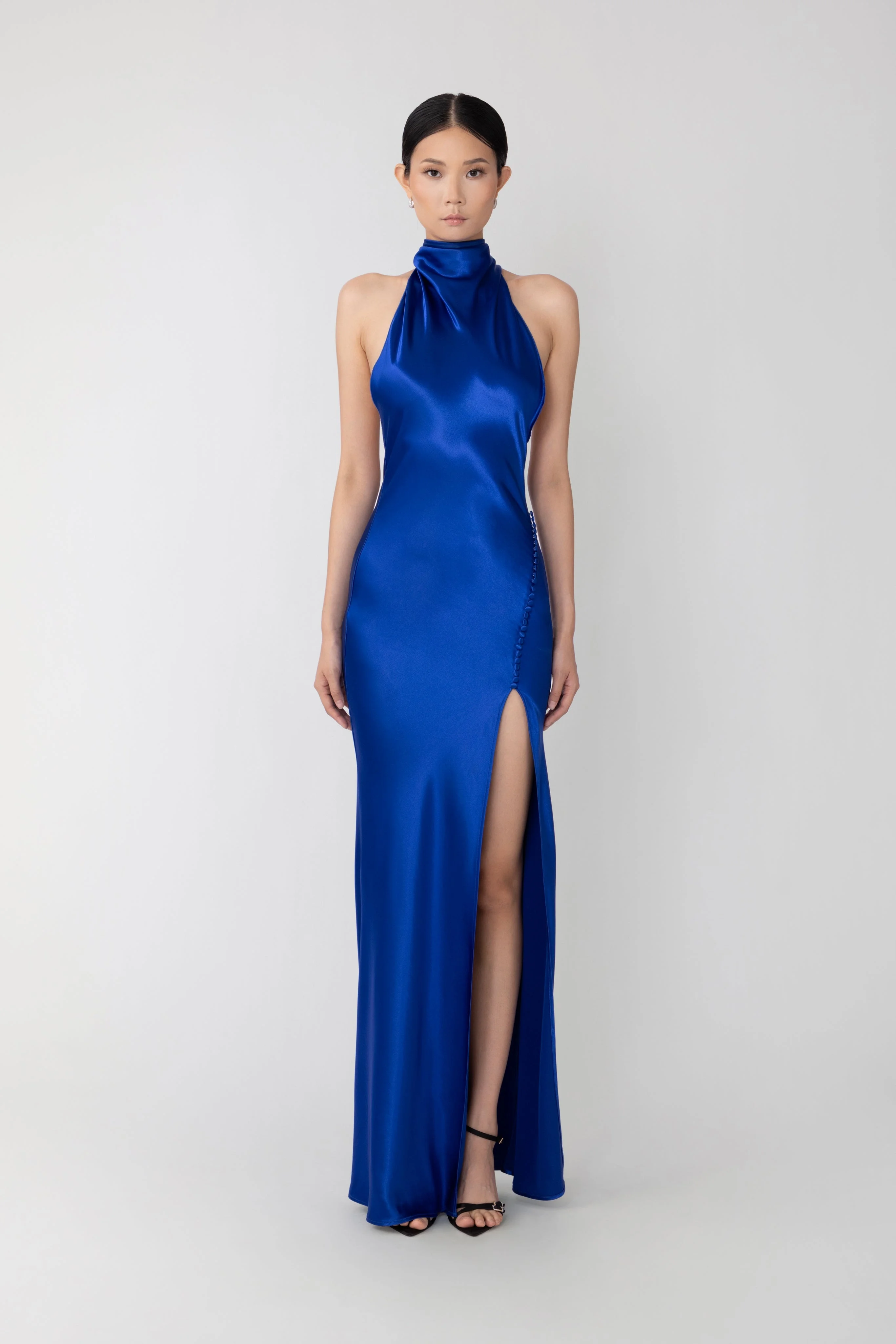 Penelope is our top bestseller that is guaranteed to make you feel effortlessly beautiful and captivating. A stunning bias-cut satin gown featuring a high neck, a low-cut back and open sides, a thigh-high side slit with covered button detail at the hip, and a large statement wings at the back of the neck. SIZE & FIT • Fits true to size, take your normal size • Designed for a slim fit • Unlined • Non-stretch fabric • Halter neck with buttons at the back of the neck • Bump friendly - select one size up from your usual size MATERIAL & CARE • Shell - 53% Viscose, 47% Rayon • Garment Care: Hand wash separately or dry clean