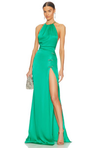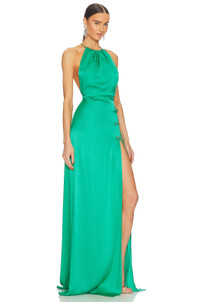 - Self: 53% viscose 47% rayon Lining: 97% polyester 3% spandex - Imported - Hand wash - Partially lined - Hidden back zipper closure - Crisscross back straps - Satin fabric with side frog knot accents and high seam split - Revolve Style No. SLEE-WD198 - Manufacturer Style No. S23D27