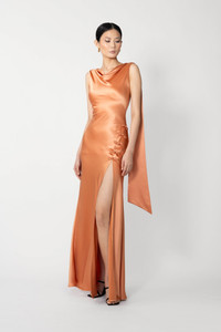 Open-back satin gown in bias-cut fit with shoulder straps and thigh-high slit, featuring enlogated statement wings that drape from each shoulder and decorative buttons that trail along the hip SIZE & FIT • Fits true to size, take your normal size • Length (shoulder to hem): size 00 to size 0 - 45.3", size 2 to size 14 - 47.2" • Model's measurements: height 5'9" bust 32" waist 25" hips 35" • Model is wearing size 2" MATERIAL & CARE • Shell - 75% Acetate, 25% Polyester • Lining - 97% Polyester, 3% Spandex • Garment Care: Hand wash separately or dry clean