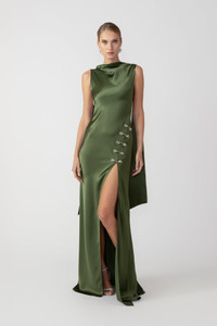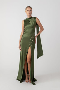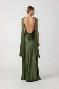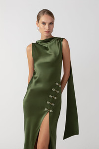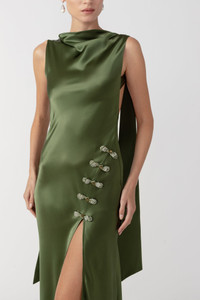 Priscilla is a bias-cut satin gown in classic olive green. A vision of modern elegance in an open back design with our signature wings draping over each shoulder strap. Featuring hand-tied pankou knots with jadeite beads decorating the thigh-high front slit. SIZE & FIT • Designed for tailoring the hem length • Fits true to size, take your normal size • Designed to be fitted at the bust and waist, loose at the hip • Partially lined • Non-stretch fabric • Length (shoulder to hem): size 00 to size 0 - 45.3", size 2 to size 14 - 47.2" • Model's measurements: height 5'9" bust 32" waist 25" hips 36" • Model is wearing size 2 MATERIAL & CARE • Shell - 75% Acetate, 25% Polyester • Lining - 97% Polyester, 3% Spandex • Garment Care: Hand wash separately or dry clean