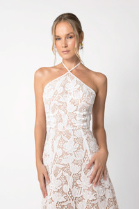 Lace midi halter neck sundress featuring signature pipa knot detail MATERIAL & CARE • Shell - 100% Polyester • Lining - 100% Polyester • Garment Care: Hand wash separately or dry clean