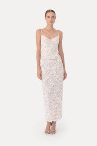 The Roma lace top is crafted from delicate corded lace, featuring a figure-hugging bustier bodice with boning for a flattering fit. The sweetheart neckline adds a refined contour, while adjustable spaghetti straps ensure comfort. Hand-tied pipa knot details accentuate the design, creating the perfect pairing with the matching Roma lace skirt.