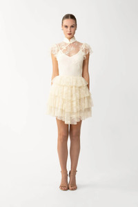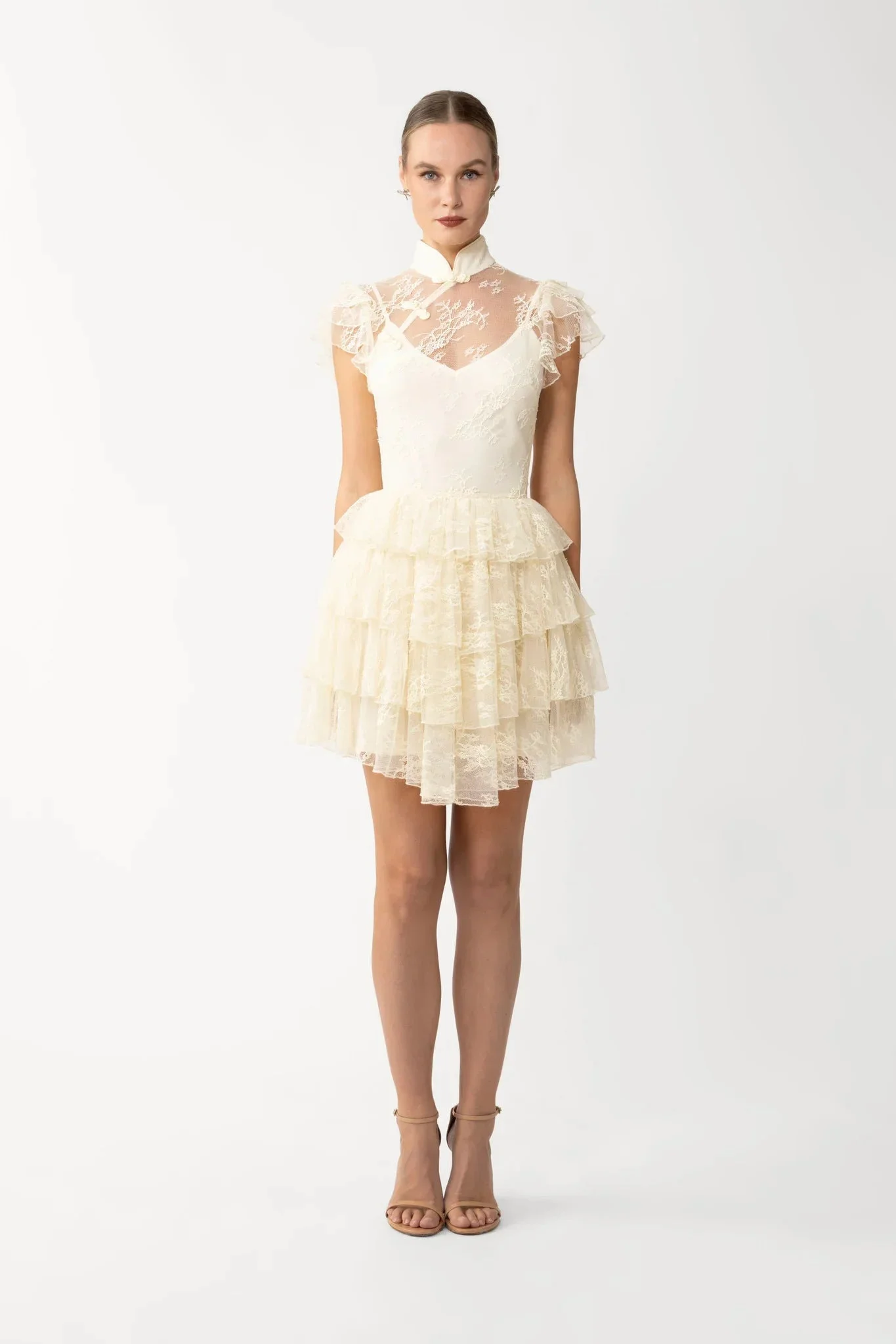 The Roux Dress is cut from intricate lace, featuring a signature mandarin collar and hand-tied pipa knots. It includes a slip for added coverage. Softly ruffled sleeves and a mini skirt add a romantic touch. SIZE & FIT • Fits true to size, take your normal size • Fully lined • Length (collar to hem): size 00 to size 0 - 31.5", size 2 - 32.3", size 4 - 32.7", size 6 - 33.1", size 8 - 33.5", size 10 to size 14 - 33.9" • Model's measurements: height 5'9" bust 32.5" waist 23.5" hips 35" • Model is wearing size 2 MATERIAL & CARE • Shell - 60% Nylon, 40% Polyester • Lining - 100% Polyester • Garment Care: Hand wash separately or dry clean