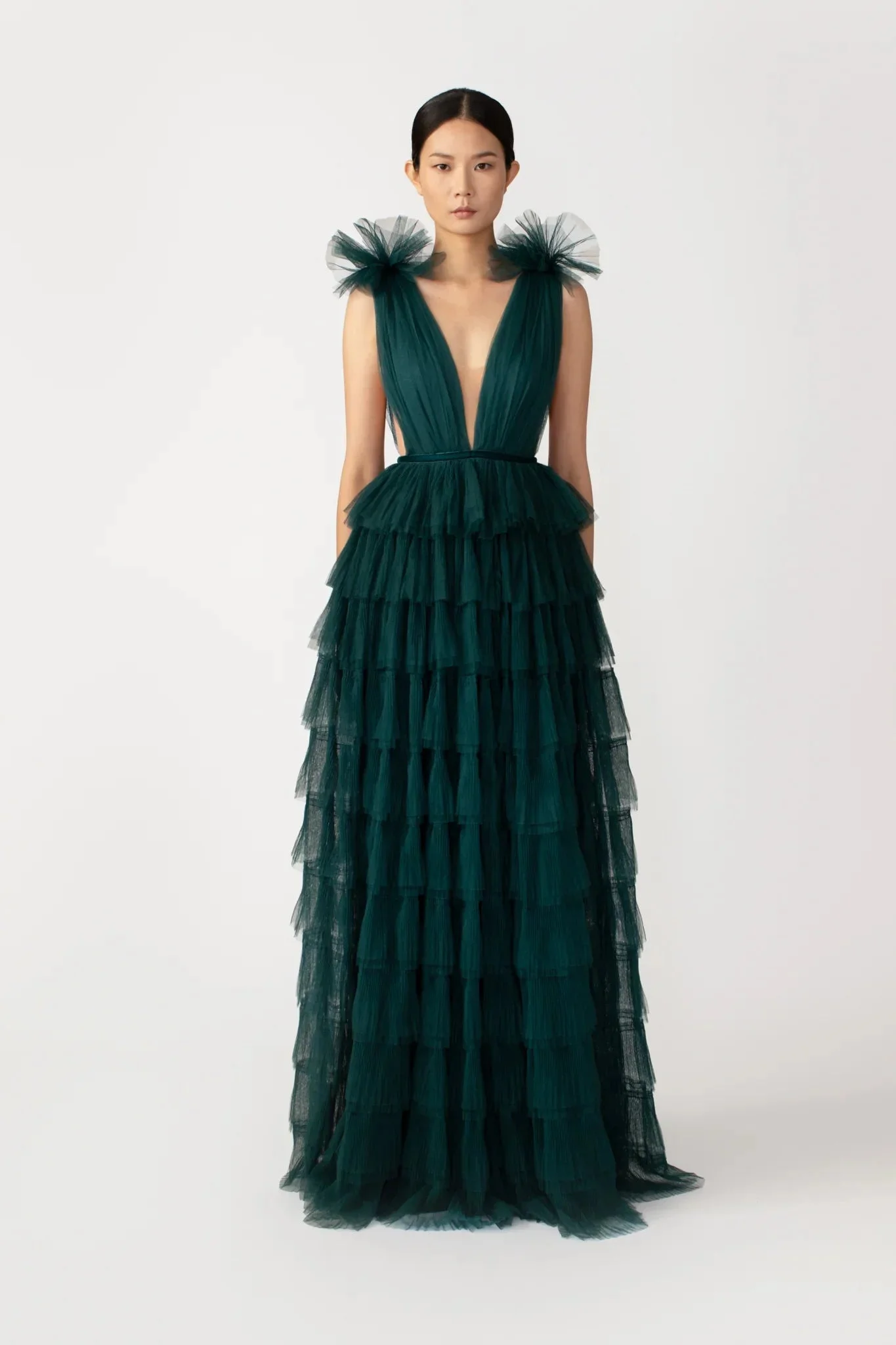 Sabrina is a romantic ruffled gown that is perfect for a black-tie event. Layered with swathes of flocked tulle throughout the skirt that cascades to a sweeping hem, featuring a plunging neckline, open back, and statement ruffles at the shoulders. SIZE & FIT • Fits true to size, take your normal size • Designed to be fitted at bust and waist, loose at the hip • Fully lined • Non-stretch fabric • Plunging neckline with mesh panels • Open back • Length (shoulder to hem): size 00 - 52.8", size 0 - 52.8", size 2 to size 14 - 56.7" • Model is wearing size 2 • Model's measurements: height 5'9" bust 32" waist 25" hips 35" MATERIAL & CARE • Shell - 100% Polyester • Lining - 100% Polyester • Trims - 100% Nylon • Garment Care: Hand wash separately or dry clean