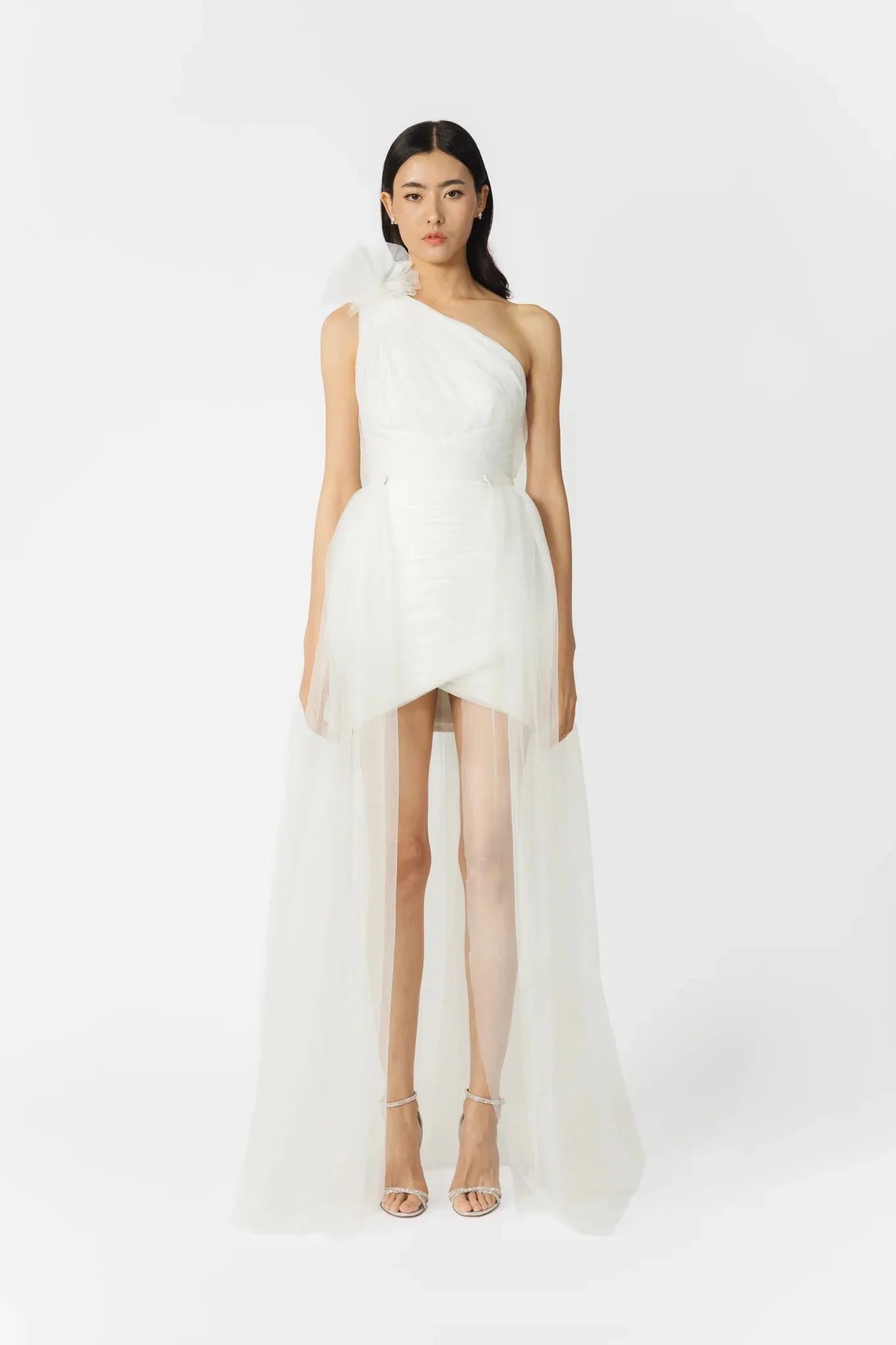 Sidney is a one-shoulder mini dress meant for significant celebrations. Its fully ruched bodice and ethereal ruffle at the shoulder give way to a wrap-style skirt attached to a removable flowing tulle train — a silhouette to feel radiant joy as you create treasured memories. SIZE & FIT • Fits true to size, take your normal size • Designed for a slim fit • Partially lined • Non-stretch fabric • Fully ruched bodice • Ruched removable full length train (attached with snap buttons) • Slightly short in length • Length (shoulder to hem): size 00 - 23.9", size 0 - 24.0", size 2 - 24.4", size 4 - 24.8", size 6 - 25.2", size 8 - 25.6", size 10 - 26.1", size 12 - 26.2", size 14 - 26.3" • Model's measurements: height 5'10" bust 31.5" waist 23" hips 35" • Model is wearing size 2 MATERIAL & CARE • Shell - 100% Polyester • Lining - 100% Polyester chiffon • Garment Care: Hand wash separately or dry clean