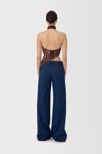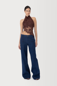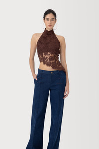 The Sylvan lace top is a halter neck cheongsam inspired top. Crafted from cotton-mix chantilly lace, it features a deep open back and a transparent waist panel for a modern allure. Hand-tied pipa knots add artisanal detail, while an asymmetric hem creates a modern finish. Pair perfectly with the Mason denim pants. SIZE & FIT • Fits true to size, take your normal size • Fully Lined • Non-stretch fabric • Model's measurements: height 5'10" bust 31 waist 22 hips 35 • Model is wearing size 2 MATERIAL & CARE • Shell - 60% Cotton, 40% Nylon • Lining - 100% Polyester • Garment Care: Hand wash separately or dry clean