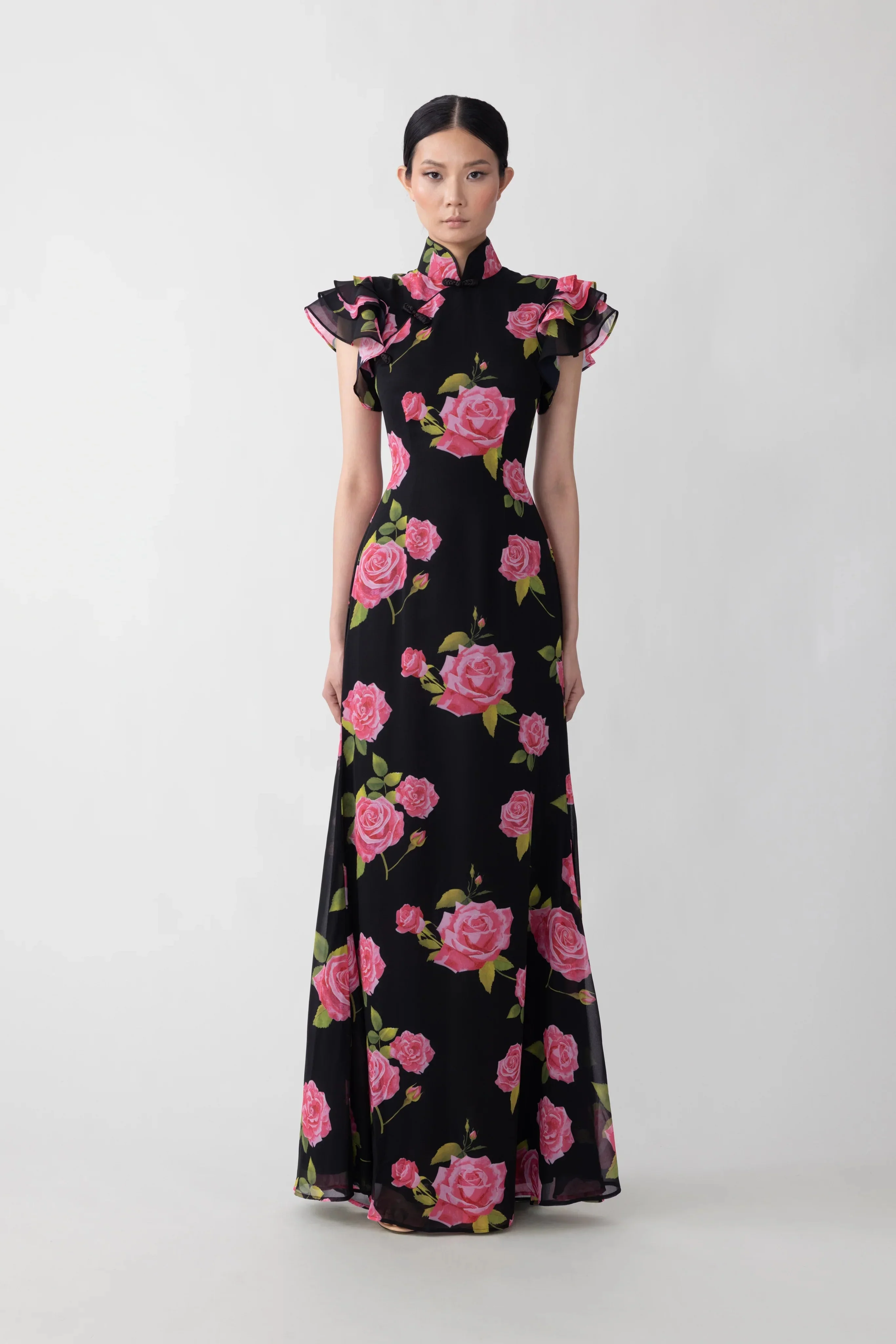 Chiffon maxi dress with ruffled sleeves featuring our signature rose print pattern SIZE & FIT • Fits true to size, take your normal size • Designed to be fitted at the bust and waist, loose at the hip • Fully lined • Non-stretch fabric • Length (collar to hem): size 00 to size 0 - 62.6", size 2 to size 6 - 64.6", size 8 - 65.0", size 10 - 65.4", size 12 - 65.7", size 14 - 66.1" • Model's measurements: height 5'9" bust 32" waist 25" hips 35" • Model is wearing size 2 MATERIAL & CARE • Shell - 100% Polyester • Lining - 100% Polyester • Garment Care: Hand wash separately or dry clean